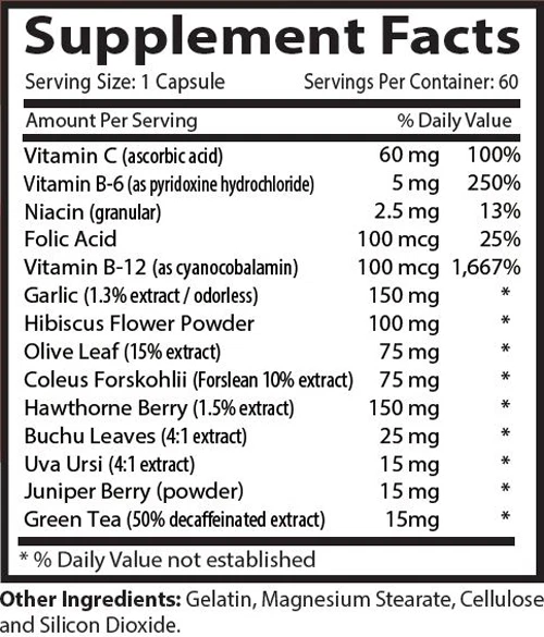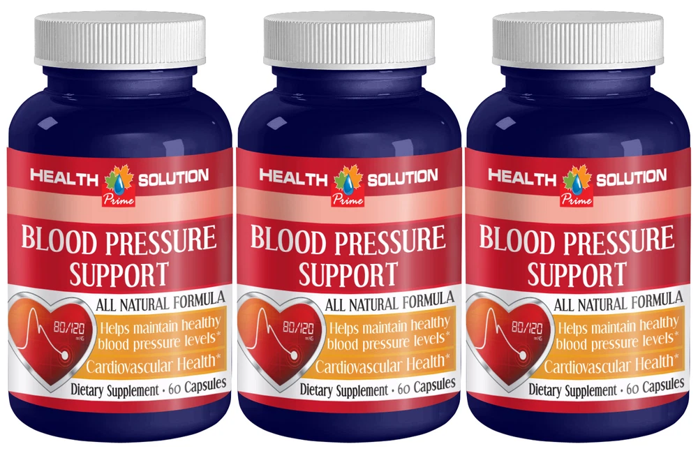 BLOOD PRESSURE SUPPORT COMPLEX 2 Bottles 120 Capsules Manufactured For Health Sol ution Prime Made in USA Blood Pressure Support Complex potential Benefits: Cardiovascular health, healthy blood pressure Healthy, normal cholesterol level Healthy, normal blood sugar level Healthy, normal leg circulation Why Blood Pressure Matters Do you worry about blood pressure? Are your numbers normal? Here's what you need to know... You’re not alone if you have concerns about your blood pressure. Nearly 1 out of every 3 American adults need to be concerned… Get your blood pressure tested right away if you haven’t in the last two years. The risk of not knowing – and not acting – is simply too great. A healthy blood pressure is one of the key measures of a healthy heart, so your blood pressure is vitally important! Blood flow depends upon relaxed, open arteries. What exactly is blood pressure? Blood pressure is a measure of the force against the walls of your arteries in response to the pumping of your heart. The amount of blood being pumped and the flexibility of your arteries both influence that force. Your blood pressure can rise when either or both of these things happen: - Your arteries contain a large amount of blood - Your arteries lose some of their flexibility If your arteries become less flexible and can’t expand easily to handle the extra amount of blood flow, your blood pressure rises. When your blood pressure rises, your heart has to work harder to keep blood flowing. Certain situations could cause this increased demand for a short time – like high intensity training – but that’s not an issue if you’re healthy. The problem is when it’s continuous. Forcing your heart to pump hard without a break can place it under a great deal of stress. And here’s a fact you may not know about blood pressure… When your blood pressure is too high, even when within the normal range, your arteries can become stiffer, which makes your heart work harder – and your blood pressure go even higher within the normal range. Is Your Blood Pressure a Concern? Two numbers are used to measure blood pressure. The systolic, or top number, measures the force when your heart contracts. The bottom number, or the diastolic, measures the force when your heart rests. Do you know your numbers? According to the CDC, a “normal” reading is 120/80. You are considered “at risk” if you’re: - Systolic is 120-139 mmHg - Diastolic is 80-89 mmHg And once your levels reach these numbers, they’re considered “high” : Systolic is 140 mmHg or higher Diastolic is 90 mmHg or higher If you are under 60 and have no other risk factors, your diastolic pressure may be most important. If you’re over 60 , your systolic pressure is your most important cardiovascular risk factor. What You Can Do More to Help Manage Your Blood Pressure: The potential benefits of a healthy diet, weight control, and regular exercise cannot be overemphasized. These lifestyle efforts have the potential to improve blood pressure control and even reduce medication needs. There are some tips: - Outdoor exercise, ideally barefoot and outdoors in the sun. Get active and walk more steps - 7,000 -10,000 steps a day. - Breathe deeply and slowly and let go off stress. The way you breathe can affect your blood pressure. Slow, deep breathing help decrease stress hormones, and in turn, lower an enzyme that raises blood pressure. - Grocery real food. Buy food that still looks like the original. In other words, brilliantly colored, sweetened fruit roll ups are NOT the same as fresh, organic berries or apples! Balance your gut flora with probiotics for blood pressure management. Eat more fermented foods and consider a probiotic supplement. Cut out processed salt. - Optimize your vitamin D levels. Both trans fats and a lack of vitamin D can contribute to stiff arteries. And too little vitamin D is related to insulin resistance and metabolic syndrome. Sunlight exposure – to get vitamin D – increases the level of nitric oxide in your skin, which helps dilate your blood vessels. - Vegetable & fruits diet. Vegetables and fruits benefit your heart and arteries. Grape seed extract increases levels of antioxidants in your blood, antioxidants are substances that neutralize free radicals – those potentially harmful compounds in your body that can damage your DNA and destroy cells. *These statements have not been evaluated by the Food and Drug Administration. This product is not intended to diagnose, treat, cure or prevent any disease. Supplement Facts Serving Size: 1 Capsule Servings Per Container: 60 Amount Per Serving Daily Value not established Vitamin C (ascorbic acid) 60 mg 100% Vitamin B-6 (as pyridoxine hydrochloride) 5 mg 250% Niacin (granular)2.5 mg 13% Folic Acid 100 mg Vitamin B-12 (as cyanocobalamin) 1,667% 100 mg Garlic (1.3% extract / odorless)150 mg Hibiscus Flower Powder 100 mg Olive Leaf (15% extract) 75 mg Coleus Forskohlii (Forslean 10% extract) 75 mg Hawthorne Berry (1.5% extract) 150 mg Buchu Leaves (4:1 extract)25 mg Uva Ursi (4:1 extract)15 mg Juniper Berry (powder) 15 mg Green Tea (50% decaffeinated extract15 mg OTHER INGREDIENTS: Gelatin, Magnesium Stearate, Cellulose and Silicon Dioxide. PREMIUM QUALITY PRODUCT
