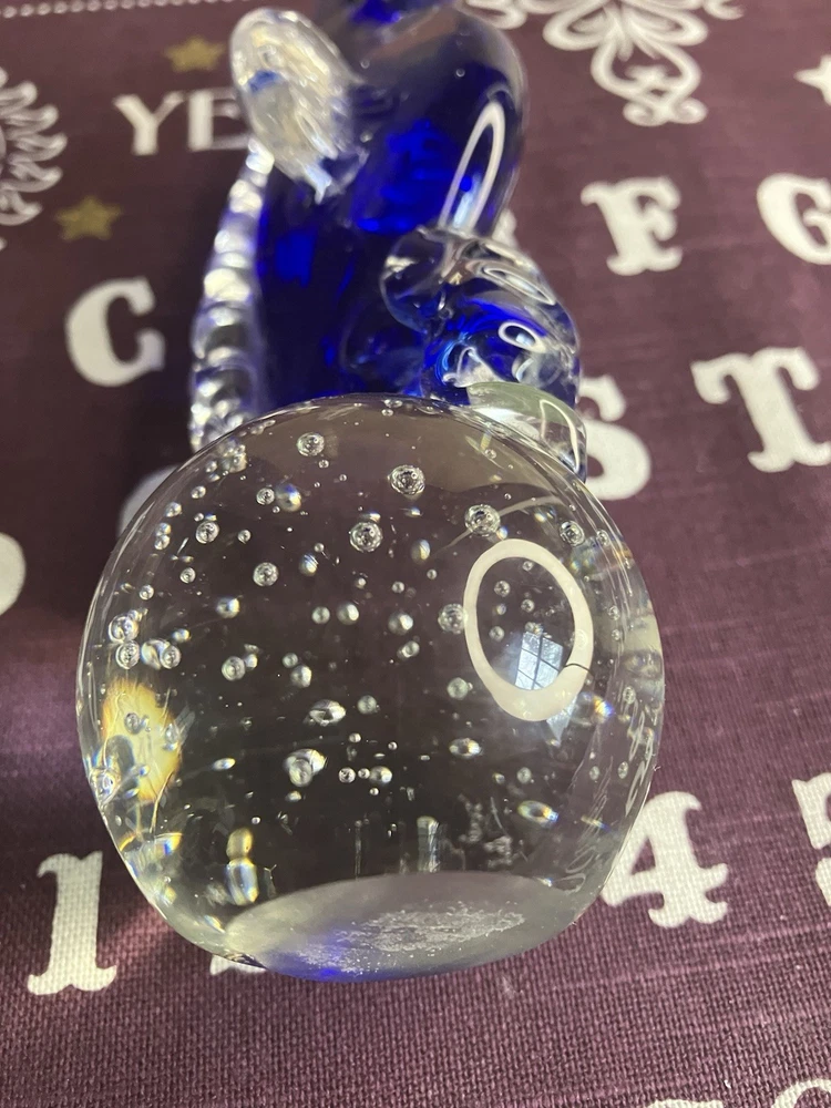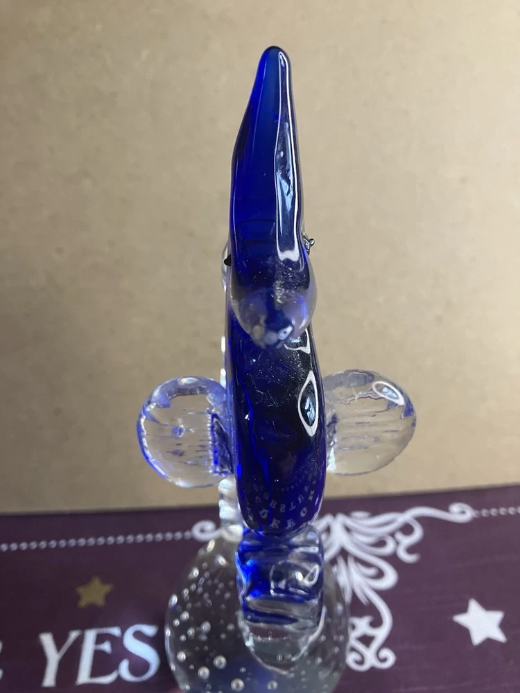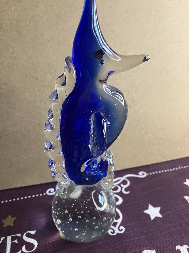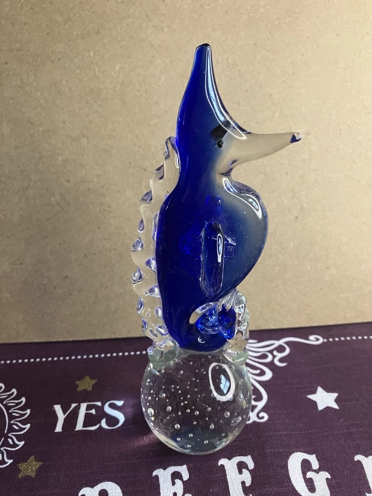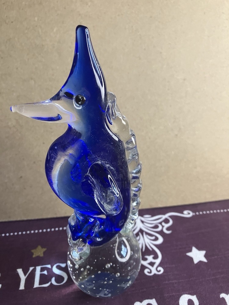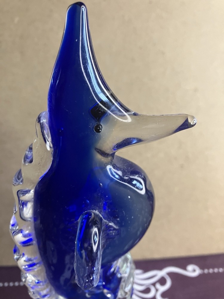 This blown glass paperweight features a stunning design of a seahorse in cobalt blue and clear glass. The intricate detailing of the seahorse shape adds a touch of elegance to any space. Made from high-quality glass through a blown glass production style, this paperweight is not only functional but also a beautiful decorative piece for any home or office. Its unique design and vibrant colors make it a standout piece that is sure to be a conversation starter. Please check out our other listings for great deals on a host of items.