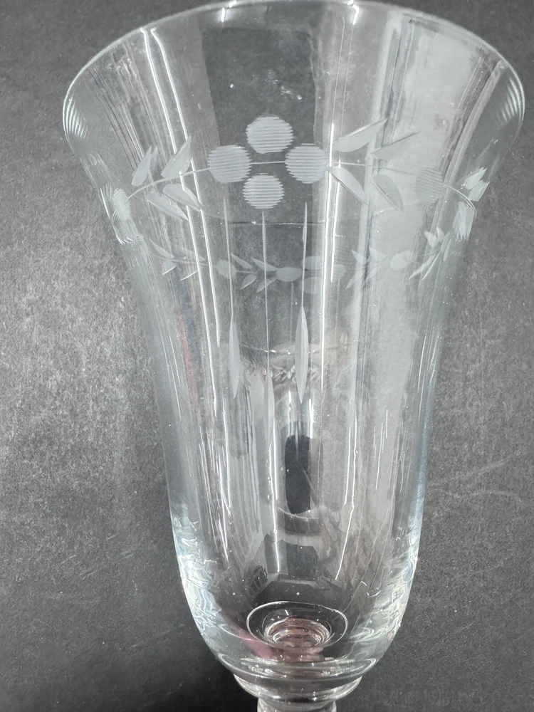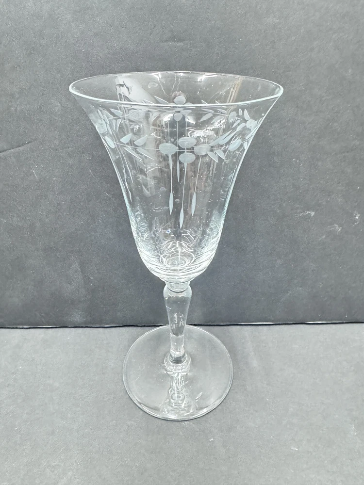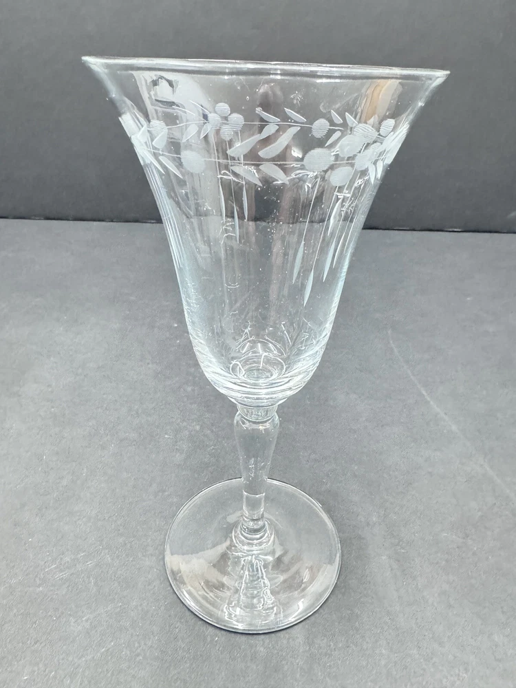 Set of four vintage clear glass water goblets featuring etched patterns of berries and leaves. Each goblet has a capacity of 6 ounces, a diameter of 3 3/8 inches, and a height of 7 1/8 inches. The goblets have an Art Nouveau style and are unmarked. They are recommended for hand wash only and are suitable for all occasions. Made of glass using blown glass production technique with cut glass details.