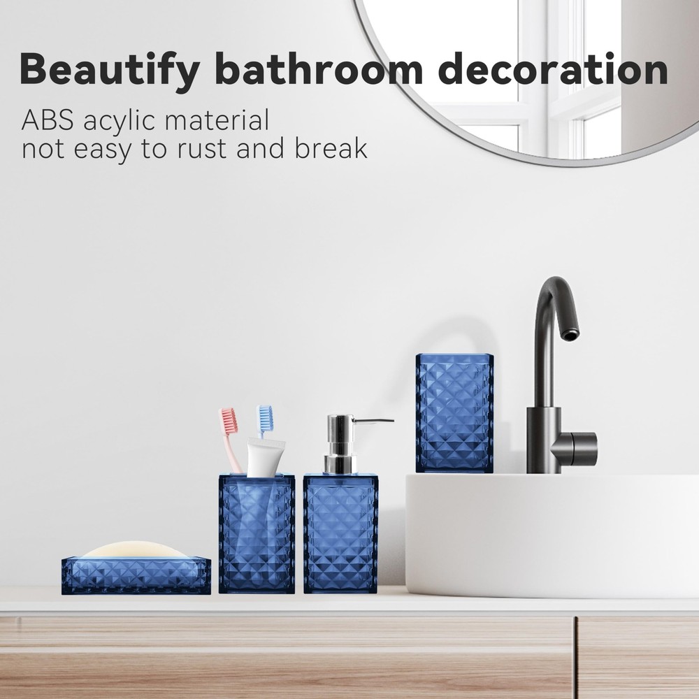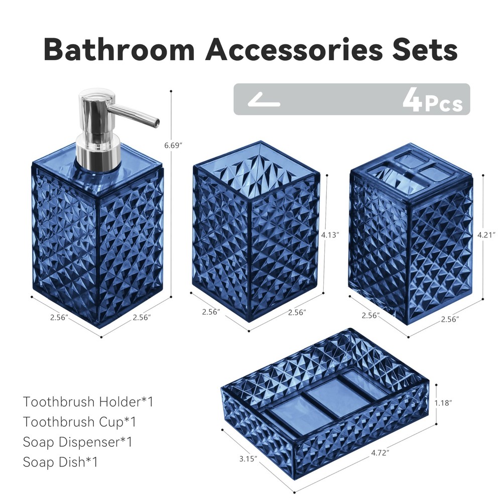 Bathroom Accessories Set This simple and elegant diamond pattern bathroom accessory set is perfectly matched with many types of bathroom decorations, making your bathroom no longer boring, greatly enhance your bathroom decoration, and make the bathroom supplies clean and tidy. Specification: Item type: Bathroom accessories set Color: Blue Feature: Diamond pattern design Quantity: 4 Pack Material: Safe and durable material Those products are made of thickened plastic, don't worry that it will be as easy to break like ceramics or glass. The accessories set can accommodate all bathroom necessities. Package include: A suit contain 1 soap dispenser, 1 toothbrush holder, 1 toothbrush cup, 1 soap dish,which can meet basic bathroom supplies storage needs. Multi-purpose soap dispenser This bottle can put many things, such as liquid soap, shower gel or lotion packaging. Simple toothbrush cup and mouthwash cup Your toothbrush has a fixed place, and it will not be messy. The separation of the toothbrush and mouthwash cup will be cleaner and hygienic. Soap boxes Thick plastic soap boxes are more durable and not easy to mold. This is a perfect gift for family members, friends, relatives, colleagues, customers, neighbors. Diamond Pattern Design: Diamond represents luxury and shining. Our 4pcs bathroom accessory sets adopt diamond pattern design, which can not only enhance the aesthetic value of the bathroom suit, but also add more flash points to your bathroom. You have several color options, the bathroom accessory set is suitable for various bathroom themes Sturdy And Safe Material: Our bathroom set accessories are made of premium plastic, easy to clean, sturdy, and durable, making your bathroom out of the ordinary Bathroom Soap Dispenser And Toothbrush Holder Set: The soap dispenser pump is easy to press, will not leak, is sturdy and durable, and has a long service life. Great for liquid hand soap, dish soap, lotion, shampoo, body wash, hand sanitizer and more. Our toothbrush holders fit most sizes of electric toothbrushes, toothbrushes, toothpaste tubes and razors. The thickened plastic material ensures it's shatterproof, can withstand drops well 4 PCS Bathroom Accessory Set: Includes 1 x soap dispenser, 1 x toothbrush holder, 1 x soap dish and 1 x mouthwash cup. Our modern bathroom accessories set keeps the bathroom organized and has a minimalist design that perfectly complements your bathroom decoration Ideal Decoration For Bathroom: Classic blue color and silver cover form a very simple decorative element that harmonizes with most styles, adding a more modern or fashionable touch to your home Giftable: Functional and beautiful design makes these 4 pieces of bathroom accessories set a great gift for a housewarming, wedding, birthday, Mother's Day, Thanksgiving Day, Christmas, and also for mom, sister, colleague, and friends