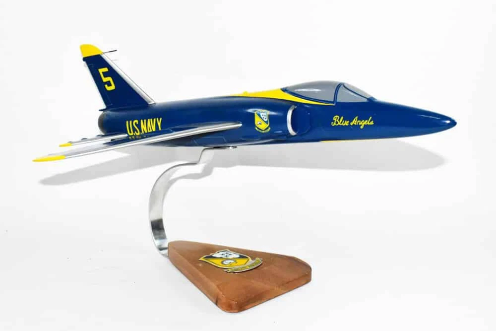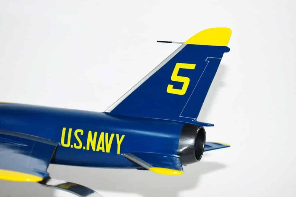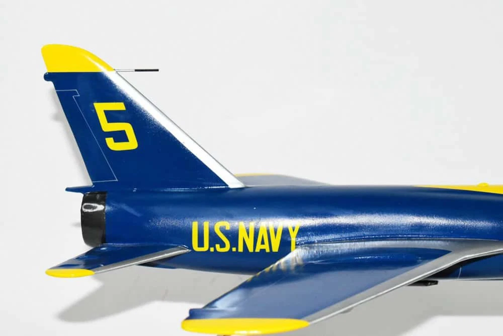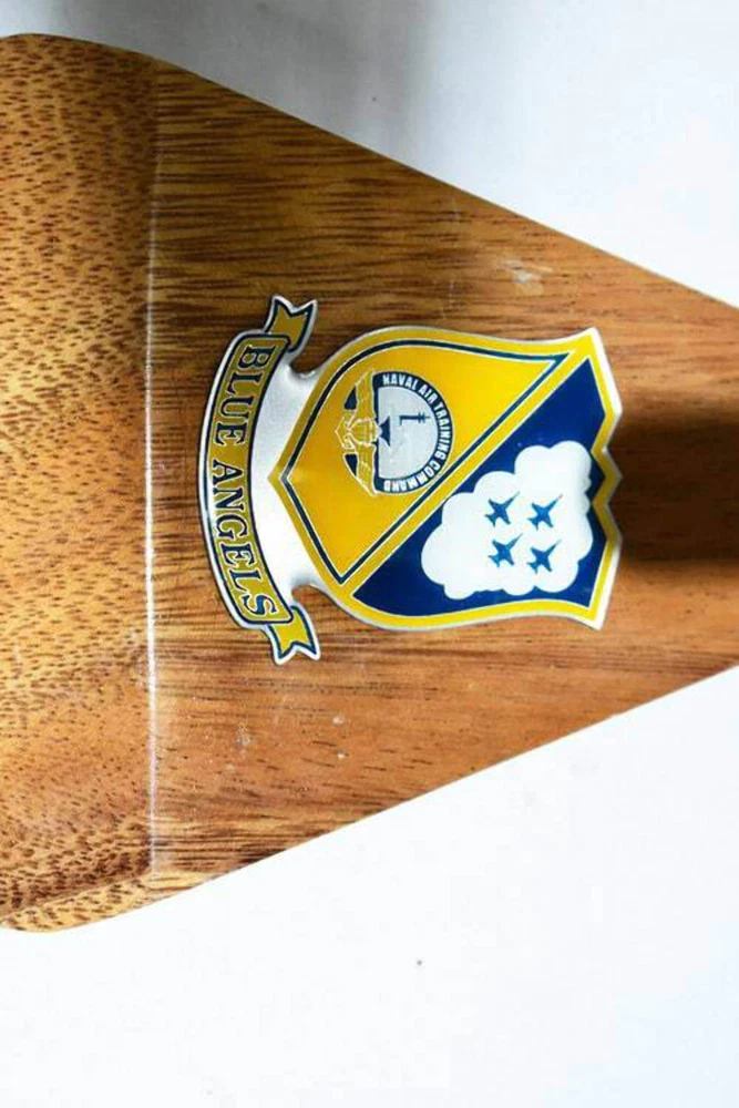 Blue Angels F-11 Tiger A handcrafted F-11 Tiger with Blue Angel markings! Each piece is carved from wood and handpainted to provide a piece you'll love. The Grumman F11F/F-11 Tiger was a supersonic, single-seat carrier-based United States Navy fighter aircraft in operation during the 1950s and 1960s. Originally designated the F11F Tiger in April 1955 under the pre-1962 Navy designation system, it was redesignated as F-11 Tiger under the 1962 United States Tri-Service aircraft designation system. The F11F/F-11 was used by the Blue Angels flight team from 1957-1969. Grumman Aircraft Corporation made 200 Tigers, with the last aircraft being delivered to the U.S. Navy on 23 January 1959. even U.S. Navy squadrons flew the F11F-1: VF-21 and VF-33 in the Atlantic Fleet and VA-156 (redesignated VF-111 in January 1959), VF-24 (redesignated VF-211 in March 1959), VF-51, VF-121, and VF-191 in the Pacific Fleet.[3] In service, the Tiger operated from the carriers Intrepid, Lexington, Hancock, Bon Homme Richard, Shangri-La, Forrestal, Saratoga and Ranger. The F11F's career lasted only four years because its performance was inferior to the Vought F-8 Crusader and the J65 engine proved unreliable. Also, the range and endurance of the Tiger was found to be inadequate. Thus, the Navy cancelled all orders for the F11F-1P reconnaissance version and only 199 F11F-1 (F-11A) fighters were built. The aircraft was withdrawn from carrier operations by 1961. It continued in service, however, in the Naval Air Training Command in south Texas at NAS Chase Field and NAS Kingsville, until the late 1960s. Students performed advanced jet training in the TF-9J Cougar, and upon completing that syllabus, were given a brief taste of supersonic capability with the F-11 before transitioning to fleet fighters. While the F-11's fighter career was short, the Blue Angels performed in the aircraft from 1957-1968, when the Tiger was replaced by the McDonnell Douglas F-4 Phantom II. Prior to the 1962 code unification, the fighter was known as the F11F; after unification, it was redesignated as the F-11. In 1973, two ex-Blue Angels F-11As were taken from storage at Davis-Monthan AFB and modified by Grumman as testbeds to evaluate inflight thrust control systems. BuNo 141853 was fitted with a Rohr Industries thrust reverser and BuNo 141824 was kept in standard configuration as a chase plane. Tests of the inflight thrust reversal were carried out by Grumman at Calverton beginning in March 1974 and continued at NATC Patuxent River, Maryland until 1975. Following the completion of these tests, both planes were returned to storage at Davis Monthan AFB. These were the last Tigers to fly.