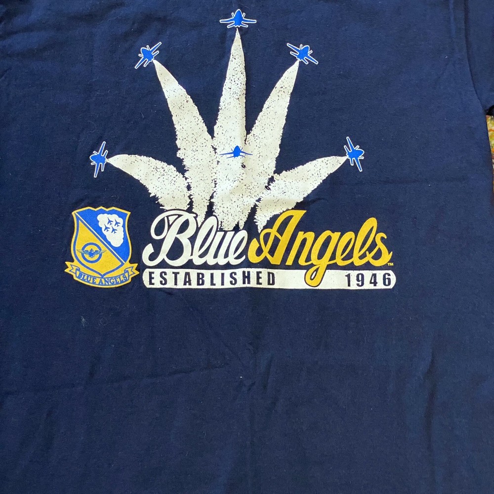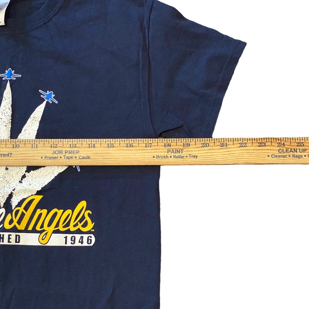This Blue Angels T-shirt in size small is perfect for any military enthusiast. The shirt features an angels planes in formation on the front with the word Blue Angels" written in bold letters. Made of 100% cotton and with a crew neckline, this T-shirt is comfortable and easy to wear. The short sleeves make it great for summer or layering in the cooler seasons. Garment care is a breeze with this machine washable jersey fabric tee from Gildan. The fit is regular and the size type is also regular, making it a great choice for both men and women. The blue color adds a pop of color to any outfit and is perfect for all seasons.