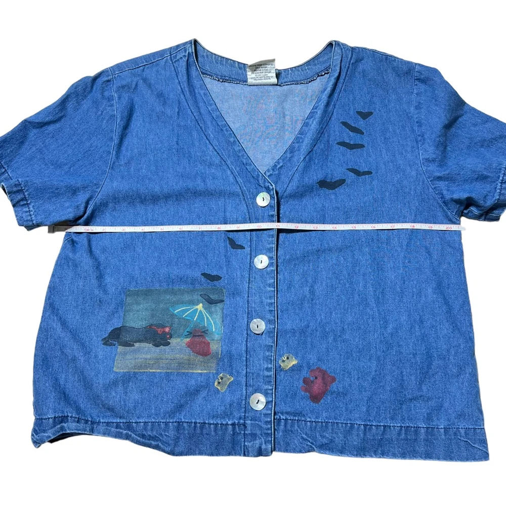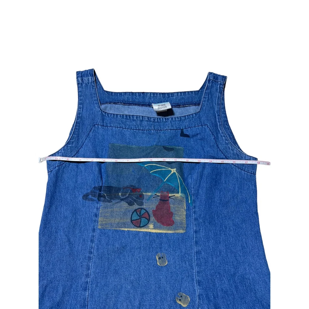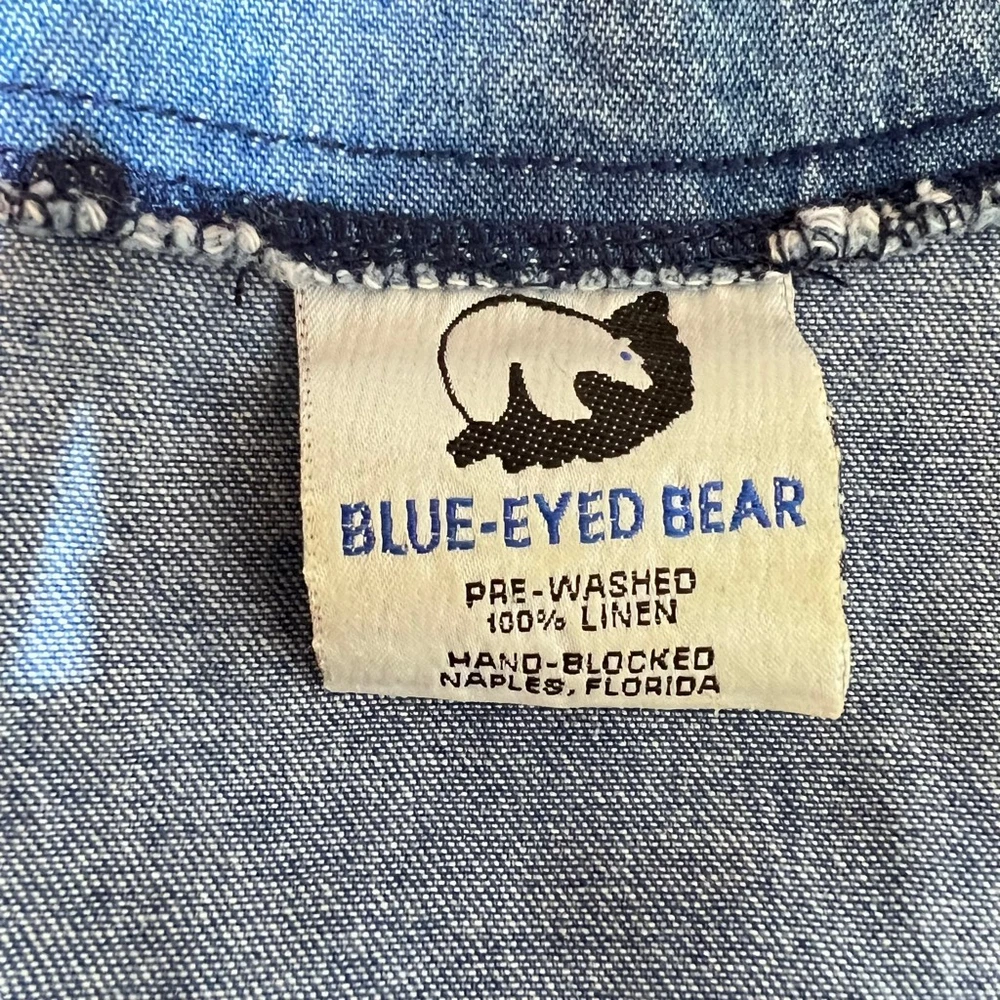 Blue Eyed Bear Denim Dress Set with Short Sleeve Top Womens Medium Chambray 90s Art to Wear Hand Painted Blocked in Naples Florida. Sheath style square neck dress with short sleeve button front top. In good pre-owned condition! No stains, tears or other signs of wear noted. Please see photos for more details and approximate measurements. Sold as pictured. Thanks for looking!