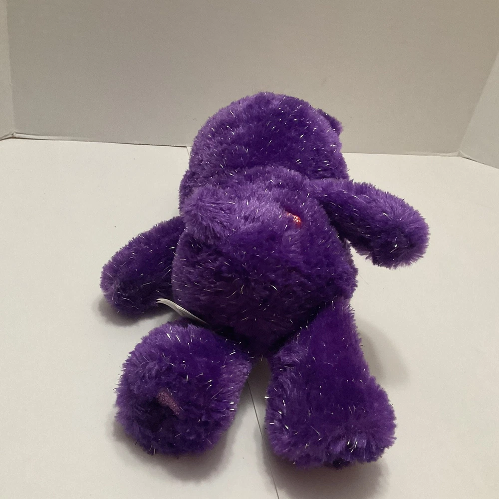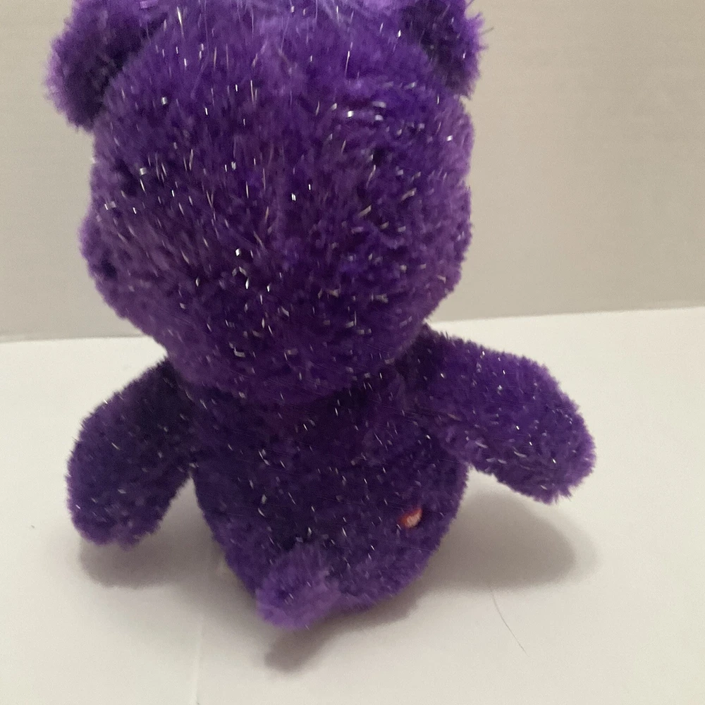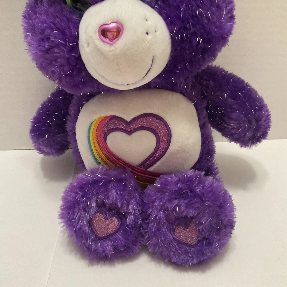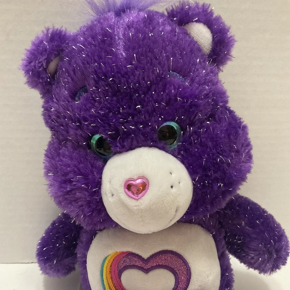 This is a 2017 Care Bear plush toy from the Rainbow collection. It features blue eyes, a purple bear color, and a sparkling rainbow heart design. This plush bear is part of the Care Bears franchise and is pre-owned.