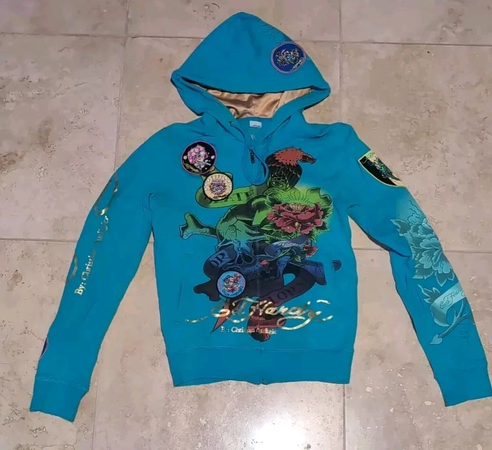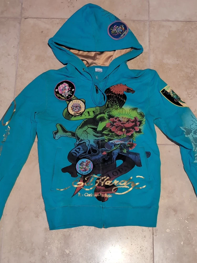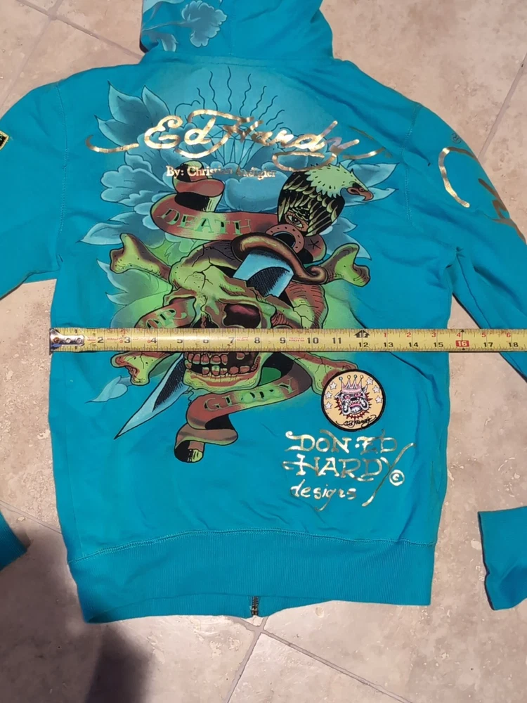 This Blue Gold Ed Hardy Hoodie, designed by Christian Audigier, is a must-have for any fashion-forward woman. The full zip style and long sleeves make it perfect for activewear, while the 100% cotton material ensures both comfort and durability. The hoodie features a skull and dagger design with the words "Death or Glory" in blue and gold, making it a statement piece that is sure to turn heads. The hoodie is available in size XS and is ideal for women who love the gold and love themes. The closure is a zipper, and the accents include the Ed Hardy logo. This hoodie is perfect for any occasion, and the blue and gold color combination is sure to make you stand out from the crowd.