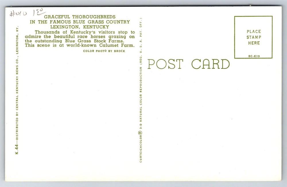 Blue Grass Country Thoroughbreds Pasture Lexington KY Postcard P2 Thank you for visiting! This is a standard size postcard, 3.5" X 5.5". In stock, usually ships within 24 hours of your purchase. Please ask questions if you are unsure about anything. My goal is for your complete satisfaction with the postcard and your experience. Check all my other listings in my store. RETIREDWITHBOOKS Powered by SixBit's eCommerce Solution
