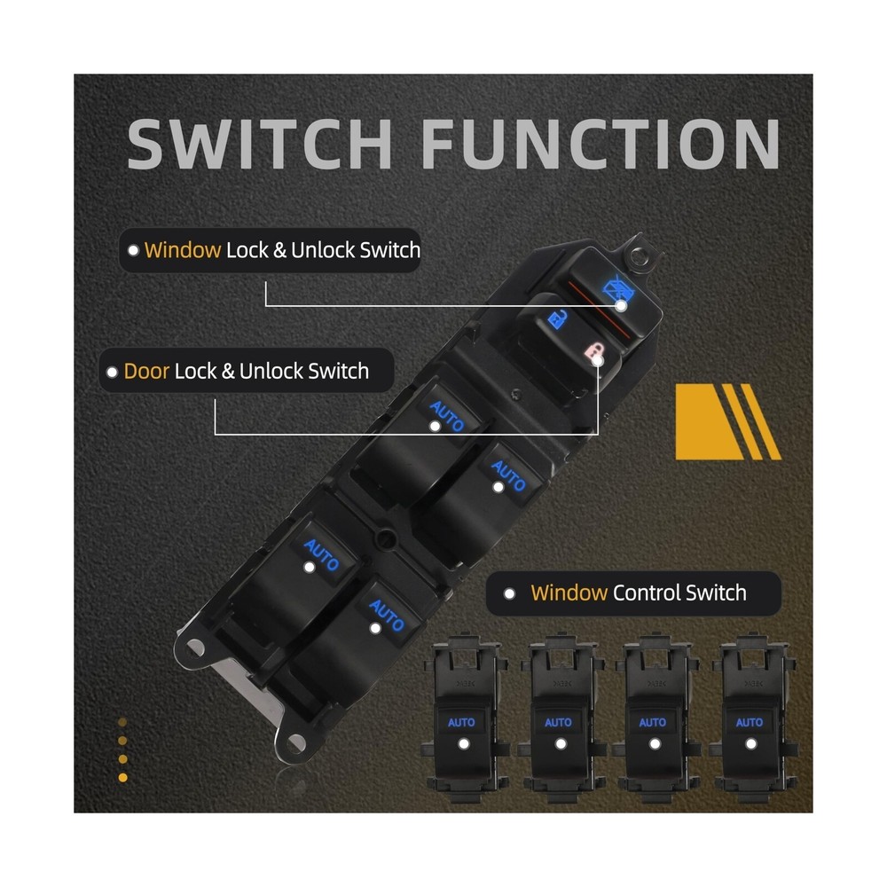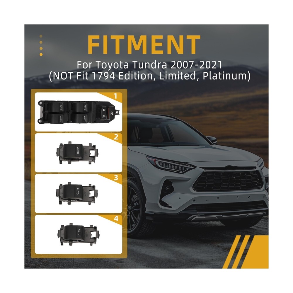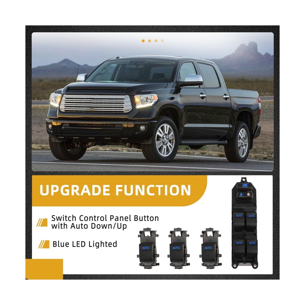 Blue LED Lighted Master Power Window Switch, for Toyota Tundra 2007-2021, Switch Control Panel Button with Auto Down/Up (NOT Fit 1794 Edition, Limited, Platinum) Description Features: Compatible Model---Compatible with Toyota Tundra 2007-2021, For use on passenger side and drive power window switch Upgrade Function---The OEM window switch of the Tundra only has the auto down function. This ndowswitch updates all switches to auto up and down, which is more convenient to use Features---The power window switch has good impact resistance, high hardness, and is not easy to wear. With blue LED light can be found faster at night Attention---Please confirm whether the OE number & picture of your old Window Switch match with our products before purchase. You can also refer to our model compatibility table for choose. Professional installation is strongly recommended NOTE---NOT Compatible with 1794, Limited, Platinum and Sequoia that Driver Side Main Switch with Double "Auto" Symbol, Otherwise, It will Blow the Fuse Product Details: Operation Mode: Automatic Operating Voltage: 12 Volts Contact Type: Normally Open Connector Type: Plug In Brand: JAVOUKA Terminal: Button Item dimensions L x W x H: 7.09 x 4.72 x 3.15 inches Actuator Type: Push Button Number of Positions: 4 Controller Type: Push Button Product Dimensions : 7.09 x 4.72 x 3.15 inches; 13.44 ounces Item model number : 84820-0R040 Date First Available : March 15, 2023 Manufacturer : JAVOUKA Country of Origin : China Best Sellers Rank: #201,908 in Automotive (See Top 100 in Automotive) #914 in Automotive Power Window Switches #914 in Automotive Power Window Switches Customer Reviews: 4.4 4.4 out of 5 stars 40 ratings Delivery We Do Not Ship Outside of the Continental US. Return Policy All items qualify for returns within 30 days of receipt. Buyer is responsible for return shipping on any item that is not damaged. Feedback We take our reputation seriously, we buy and sell online, so we understand the value of trust. If you are unsatisfied with your order, please contact us and we will work with you to resolve it to your satisfaction.