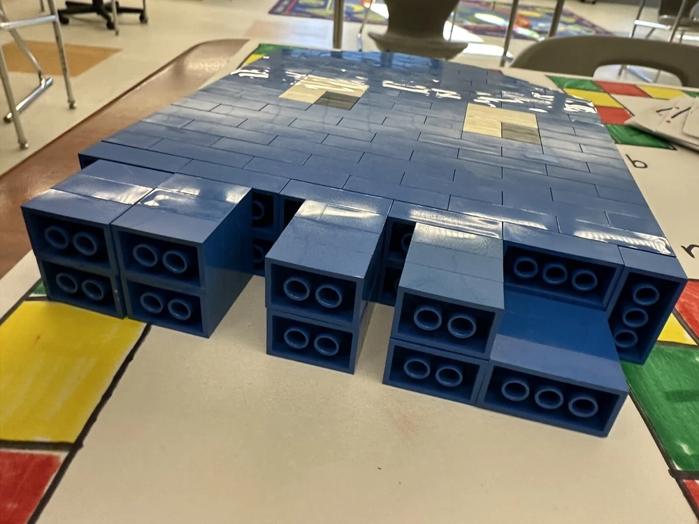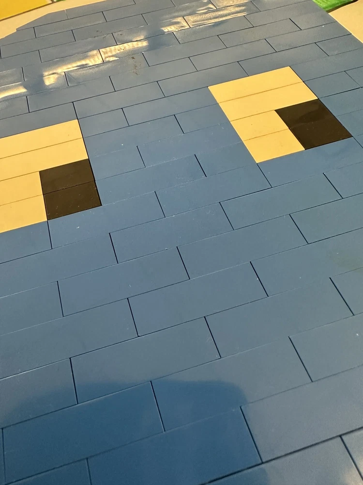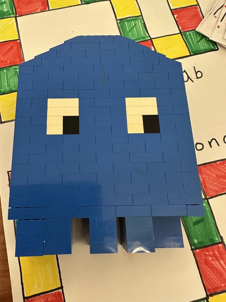The product is a vintage blue Lego Pac-Man ghost figure. It is a building toy piece or part related to the character Ghost from the Pac-Man video game. The figure is designed in the style of classic Lego pieces and features a blue color.