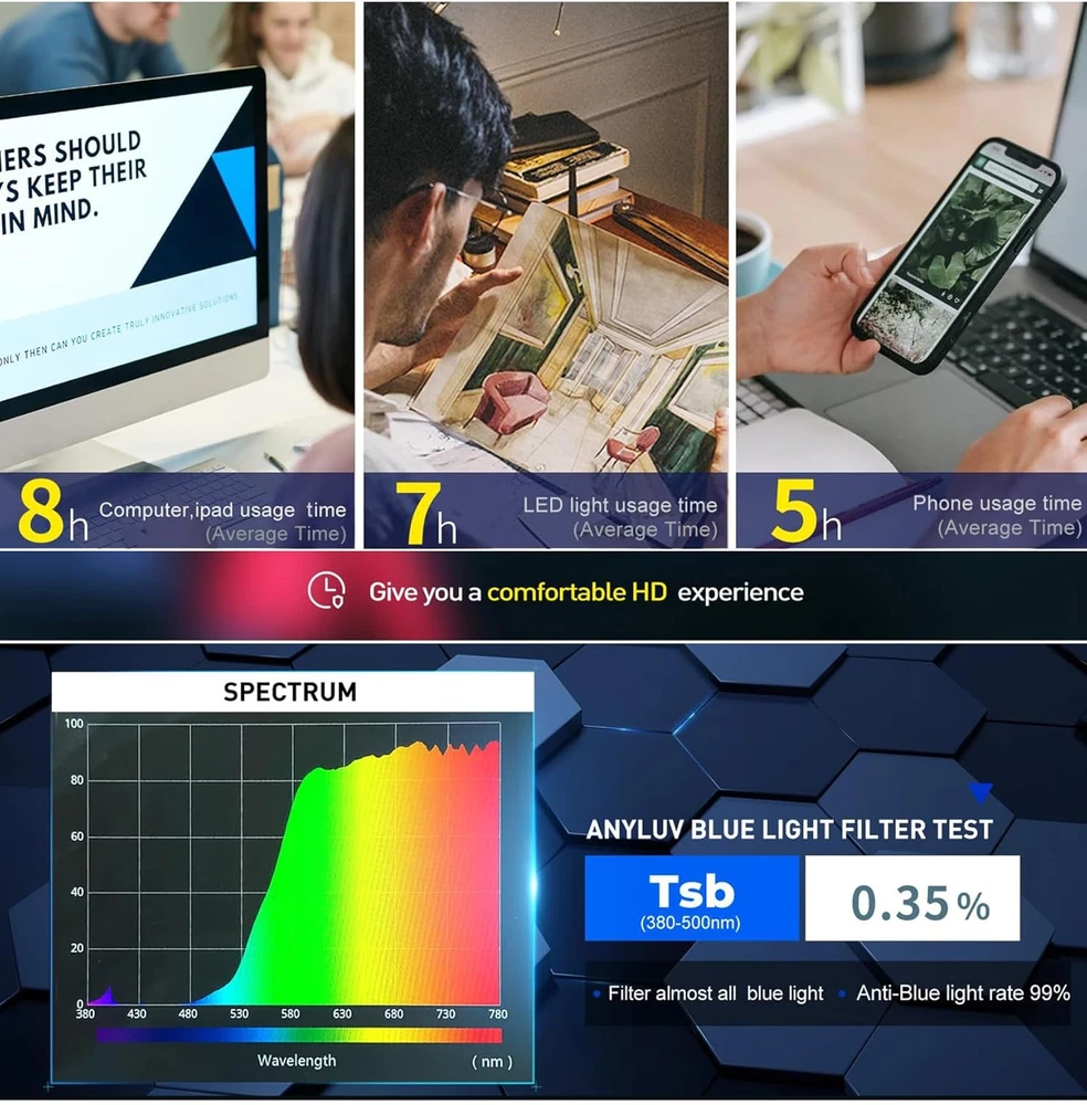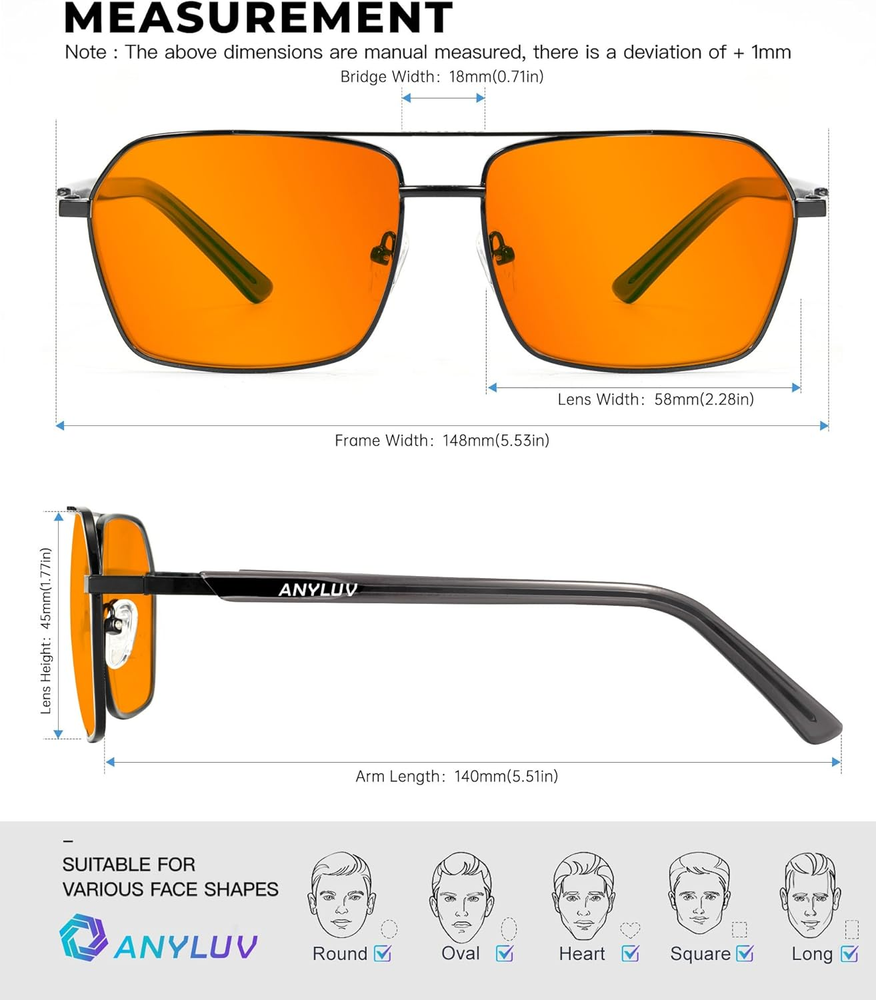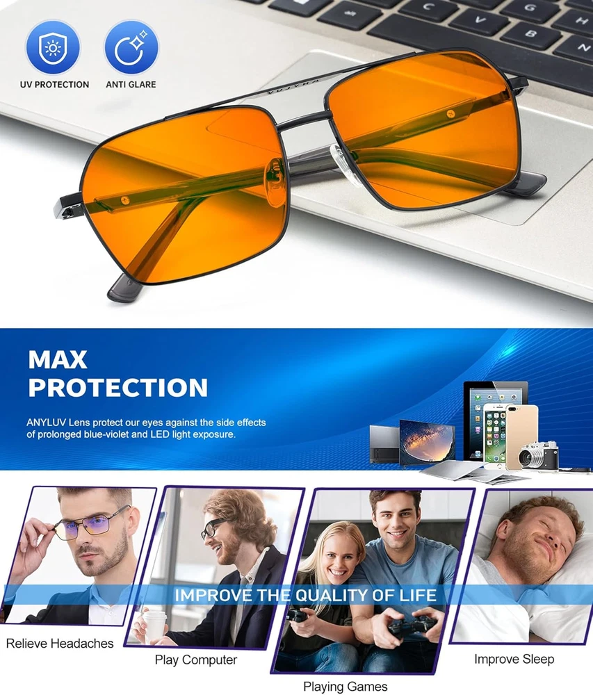 💻Blue Light Blocking Rate: 99%⏩ These blue light gaming glasses can filter 99% of harmful blue light from computers and other devices, help release eye fatigue. When you playing game on electronic screens for long time, these ANYLUV blue light gaming glasses for men can help make eyes relaxed, meantime improve sleep quality 💻Amber Blue Light Blocking Glasses⏩ This type of blue light glasses lens can effectively blocks almost all blue light, alleviating eye fatigue. providling outstanding blue light protection. Recommended for wearing during electronic gaming time, and contributes to better sleep. 💻Trendy Blue Light Glasses⏩ Designed with square slim frame and ANYLUV logo decor temple, very exquisite and fashion style. These anti blue light glasses help show a sophisticated look that complement any outfits, whether you're working or casual daily life 💻Upgraded Metal Material⏩ Lightweight metal frame and temple make the blue light glasses men more durable and high quality. Soft rubber nose pad comfortably fit your nose and isn't slipping easily 📖After-Sales Brand Service⏩ ANYLUV attach great importance to product quality and customer satisfaction. Each customer can enjoy after-sale brand service for our reading glasses. Please feel free to contact our customer service if you have any product problem. Product Description The video showcases the product in use. The video guides you through product setup. The video compares multiple products. The video shows the product being unpacked. hero-video Merchant Video 1 WEAR-RESISTANT FRAME 2 METAL HINGE 3 PREMIUM MATERIAL 4 PREMIUM BLUE LIGHT LENS 5 PACKAGE INFO ANYLUV Blue Light Glasses Contrast Add to Cart Add to Cart Add to Cart Add to Cart Customer Reviews — 4.5 out of 5 stars 222 4.4 out of 5 stars 84 4.4 out of 5 stars 899 — Price — $29.99 $ 29 . 99 $23.99 $ 23 . 99 $21.99 $ 21 . 99 $50.00 $ 50 . 00 Color Low color distortion Low color distortion Low color distortion Amber tinted lens Amber tinted lens Anti-Blue Performance Significant reduce blue light Significant reduce blue light Significant reduce blue light Blocks almost all blue light Blocks almost all blue light Applicable Scenario For all-day use For all-day use For all-day use For extensive screen users For extensive screen users Lens Width 2.20 inches 2.28 inches 2.28 inches 2.16 inches 2.05 inches Lens Height 1.50 inches 1.57 inches 1.54 inches 1.34 inches 1.69 inches