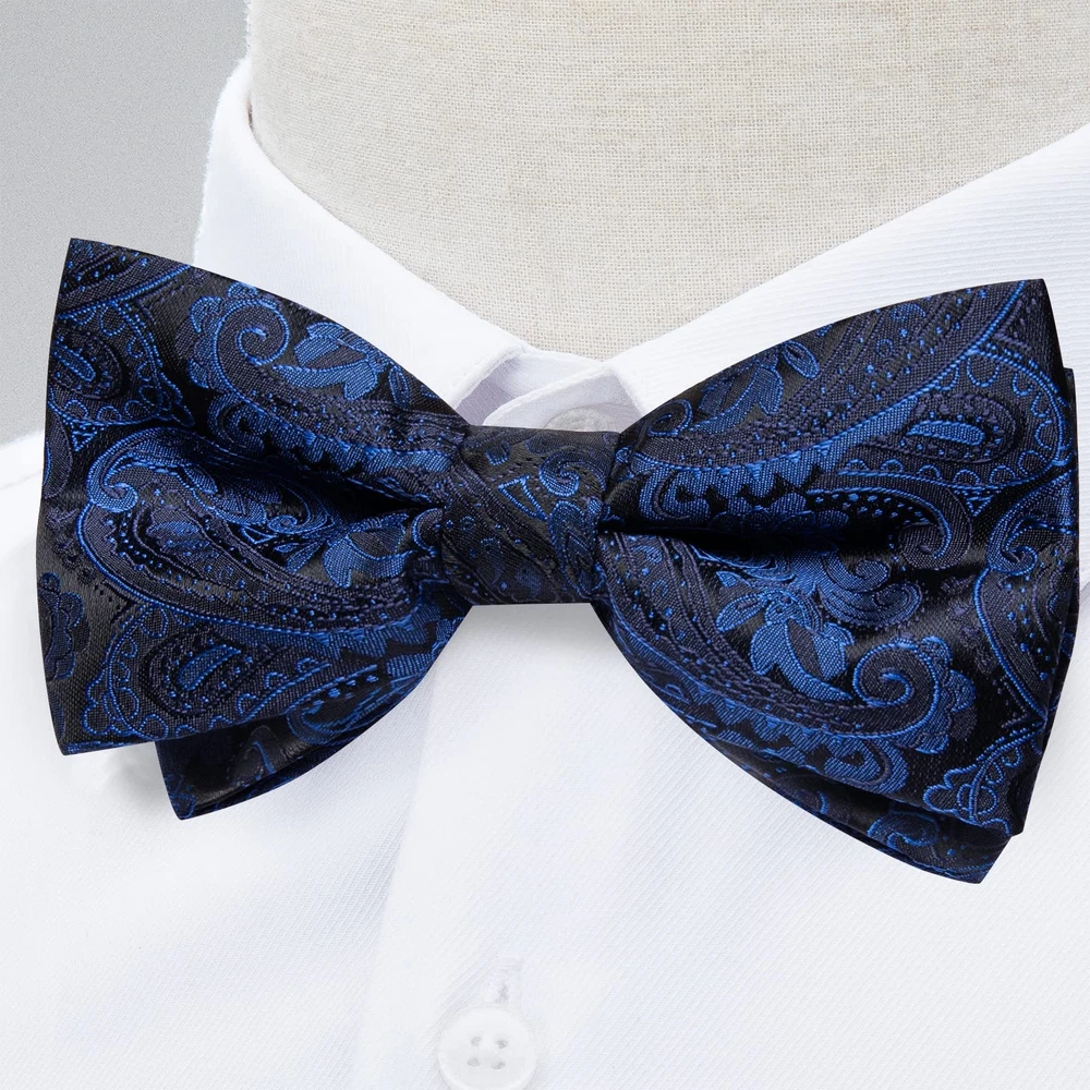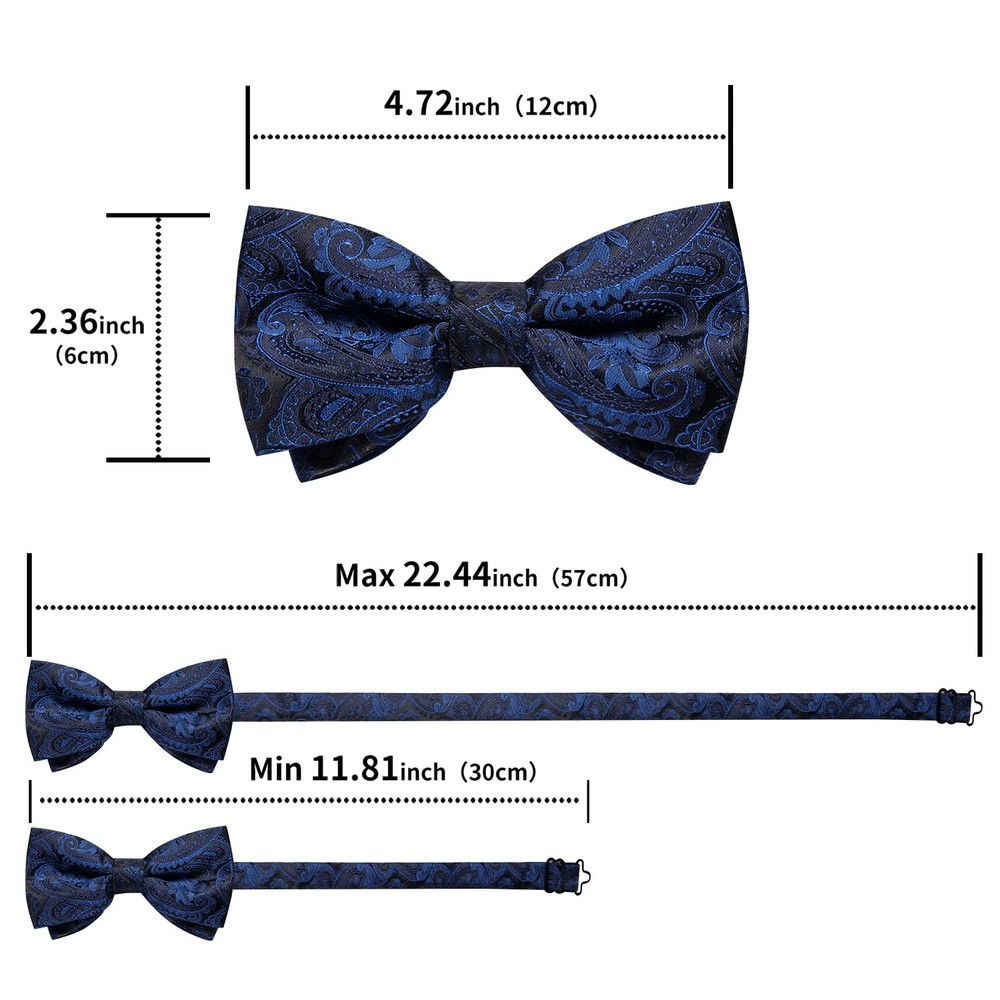 pre-tied bowtie + pocket square + cufflinks 【Package Includes】Blue Pre-tied Bowtie + Handkerchief + Cufflinks + Gift Box. This bowtie set is the best gift for father, son, husband, friends on Father's Day, Christmas, Valentine's Day, New Year and so on 【Adjustable Size】Adjustable Neck Size 11 inches - 19 inches, suitable for boy aged older than ten years and adult male. Bow tie size: 4.7 inches x 2.4 inches (12 cm x 6 cm), Pocket square size: 9 inches x 9 inches (23 cm x 23 cm), Cufflink Diameter: 0.55 inches (1.4 cm) 【Top Quality】This bowtie and handkerchief are made of high-quality silk, which will make you feel comfortable wearing. And this bowtie has good durability and wear resistance 【New Design】This is an adjustable bow tie with classic patterns and a variety of colors suitable for all formal and informal occasions, becoming the focus of attention with its unique accessories 【Occassion】This pre-tied bow tie set is suitable for various occasions, such as weddings, gatherings, events, banquets, graduation, dates, business meetings and so on. Wearing this bow tie will make you exude charming charm in these occasions