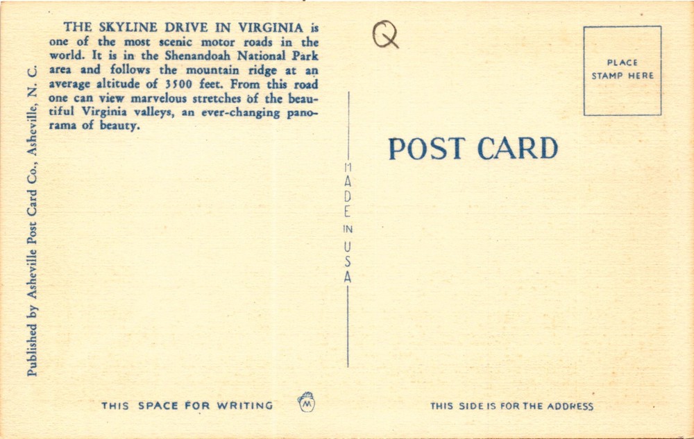 The front of the postcard features an image of the Blue Ridge Mountains of Virginia, specifically showcasing the Skyline Drive. The Skyline Drive is a scenic motor road located in the Shenandoah National Park area of Virginia.