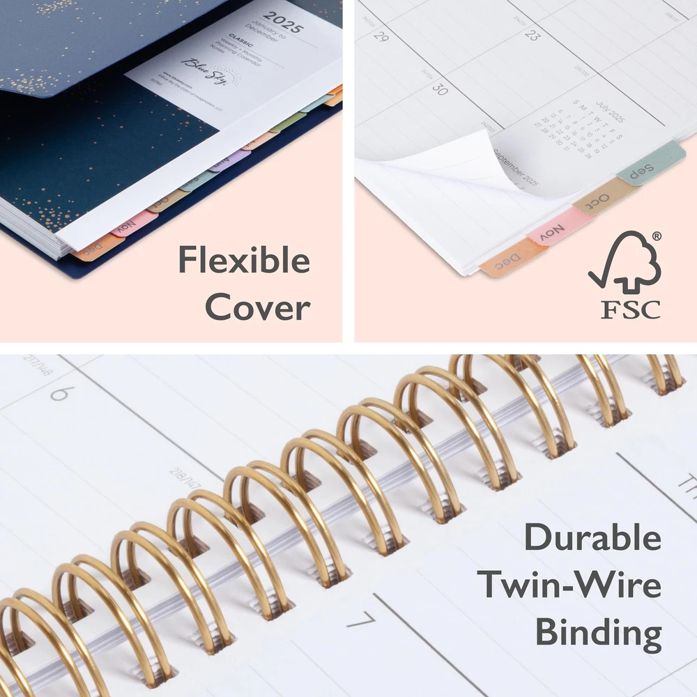 Blue Sky 2025 Weekly and Monthly Planner Calendar, January 2025 - December 2025, 5.875” x 8.625”, Flexible Cover, Laminated Tabs, Wirebound, Storage Pocket, Gold Foil Details, Starlight (Starlight- 2025, 5.875" x 8.625") Plan your year in style with the classic aesthetic of this 2025 planner. This weekly and monthly planner will keep you organized everywhere you go. Simple page designs add a touch of sophistication and offer plenty of room for all of your important information. Designed with practicality and ease of use in mind, this agenda's monthly calendar tabs allow for easy access to each month’s plans while weekly views offer ample writing space for detailing each day. Thirty sheets of notepaper at the back of the planner offer additional space for you to jot down your thoughts, ideas and musings. A yearly overview calendar, a yearly goals layout and budget spreadsheet assist with long-term planning. A snap-in ruler/bookmark, double-sided paper pocket for loose leaf materials, listed holidays and a reference sheet with US States and Capitals add to the usefulness of this organizational tool. Quality flexible covers and metallic twin-wire binding provide reliable durability for daily use. Stay on track throughout the year with this portable 5.875” by 8.625” planner dated January 2025 - December 2025. Mix and match with other Classic Collection planning products from Blue Sky to organize your daily life. Blue Sky creates modern and sophisticated organizational planners and calendars to fit the scheduling needs of busy people - whether it’s for business professionals, college students, teachers, or anyone with appointments to make note of. Keep your life organized with our full line of products including desk pad calendars, wirebound tabbed weekly and monthly planners with contacts and notes pages to accommodate your scheduling needs, and laminated two-sided wall calendars, all in a variety of colors and patterns to suit your lifestyle and personality. January 2025 - December 2025 planner with 12 months of monthly and weekly pages for easy planning and scheduling; 6 bonus monthly pages (July 2024 - December 2024) are included Monthly pages contain previous and next month reference calendars for long-term planning, and a notes section for important projects; Major holidays listed, elapsed and remaining days noted Weekly view pages offer ample lined writing space for more detailed planning, allowing you to keep track of your appointments, reminders, ideas and to-do lists every day of the week This 5.875" x 8.625" planner has a generous, tabbed notes section that provides 60 pages of lined writing space, while a budget tracker helps you manage your finances The planner’s gold-tone, spiral bound spine, flexible, dark blue cover and colorful, durable monthly tabs ensure that this planning calendar can withstand the demands of your busy schedule Shipping from the USA All of our products are shipped from the USA, ensuring quick delivery to your destination. Payment We offer the following payment methods: PayPal, credit card, bank transfer, and eBay's secure payment system. Free Shipping & Free Returns Shipping within the USA is FREE. Additionally, any return is absolutely free for you. Risk-Free Purchase You have the option to return an item within 30 days without any justification. We cover the return shipping costs! Fast Shipping We ship immediately upon receipt of payment. Generally, the package is delivered within 2-3 days in the USA. If it takes longer, we will contact you. Quality and Costs Made in Europe, USA, China No customs fees or additional charges Total satisfaction guarantee Invoice with declared VAT available upon request in .pdf format Feedback Your feedback is very important to us. After you pay for your purchase, you will automatically receive positive feedback from us.
