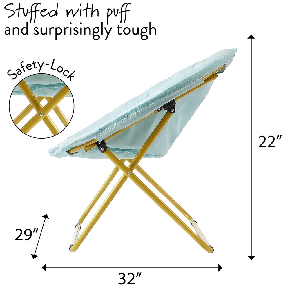 Accent any room with this Urban Velvet Channel Stitch Saucer Chair. It has a wide design and cozy velvet fabric for a comfortable place to study, relax or watch TV after a long day. The Urban Velvet Channel Stitch Saucer Chair features a durable steel frame and is easy to transport or . It's ideal for dorm rooms, apartments, bedrooms and more. It adds a pop of color to any room and is sure to become everyone's favorite spot to sit or lounge. Add contemporary style to your living room or den area, entertainment room or any space where you need comfy extra seating. This Urban Velvet Channel Stitch Saucer Chair makes a wonderful addition to your home and is also ideal for gaming or to place in a playroom. No assembly required. COMFORTABLE COZY DESIGN: This Velvet Saucer Chair will hug your body when you are relaxing while watching TV, reading, playing video games or lounging around. Made with soft velvet fabric, this chair is extra cozy for sitting and lounging around. FOLDING FRAME - NO ASSEMBLY REQUIRED: Ready to use once you receive your package! This no assembly chair will be ready to enjoy once it arrives. Just unfold and place in your desired room of the house. Simply fold chair down flat for easy storage or transport when not in use. HIGH QUALITY: Constructed from a sturdy metal tubular frame that features a safety locking mechanism on the leg. Faux Fur fabric is made from durable, high quality Polyester that is easy to clean and maintain by spot cleaning with soap, sponge or warm water. VERSATILE USE: Place this chair in any room of your house, dorm room or apartment for an added cozy seating option. Enjoy this chair in your bedroom for lounging or place in your Living Room or Dens for a go to seat to unwind and watch TV or read a book. Available in a variety of colors, this chair is perfect for anyone and makes for a great gift! DIMENSIONS: This super soft saucer chair measures 27.95"L x 30.70"W x 27.74"H. The edge of the front seat is 14” from the floor, and seat is 16” deep and has 19” back. An ideal perfect size for kids, teens, and young adults.