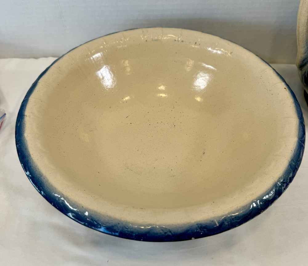 ** see pics for small chip (not all the way thru). This two-piece Blue & White Stoneware Wild Rose Pitcher & Bowl Basin Wash Bath Set is an antique Victorian-era piece handcrafted in the United States. The set features a beautiful fishscale and wild roses pattern on semi-gloss finish stoneware, with a blue color scheme. The pitcher and bowl are both round in shape, with the pitcher standing at 10 inches tall and the bowl having a diameter of 15.25 inches. This vintage wash set is perfect for all occasions and adds a touch of floral charm to any home decor.