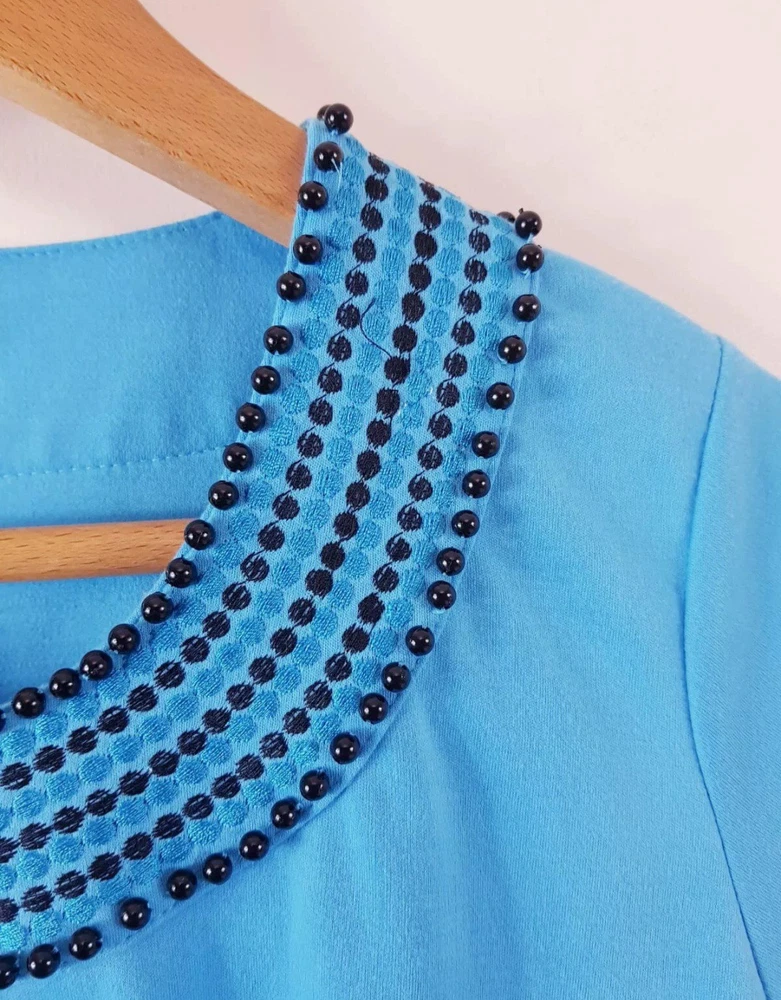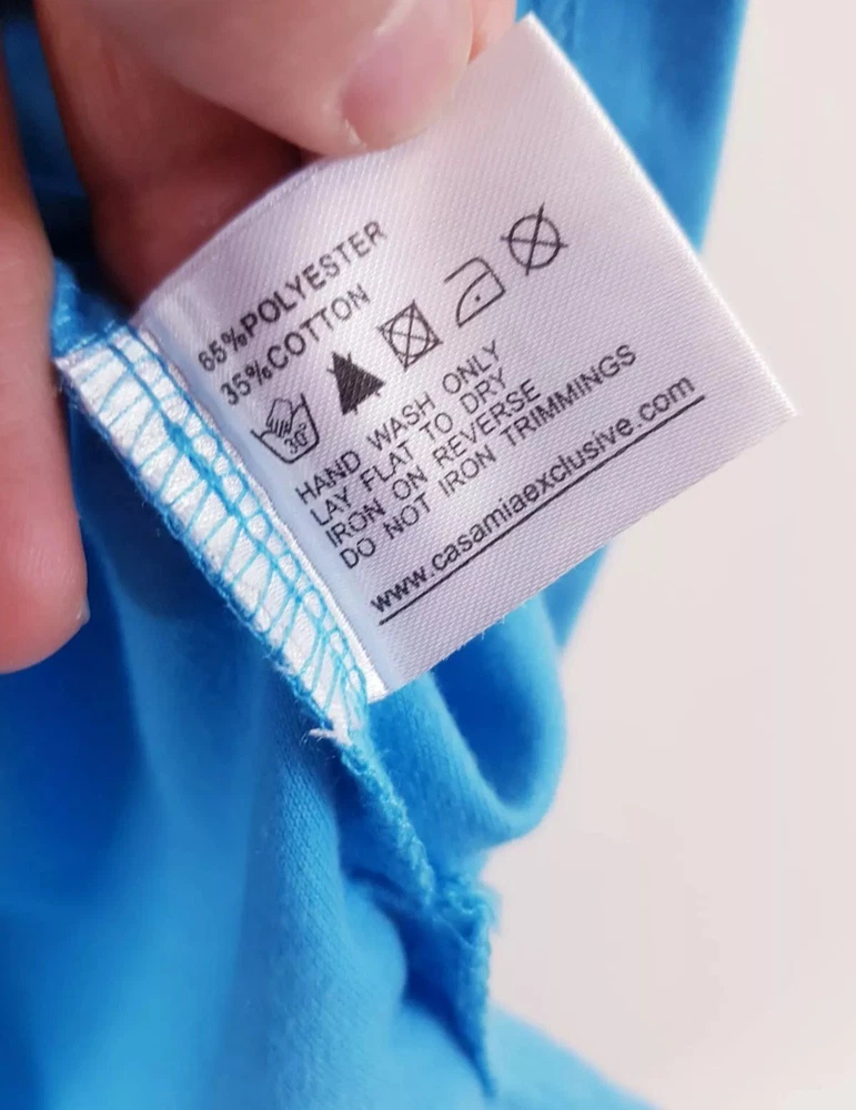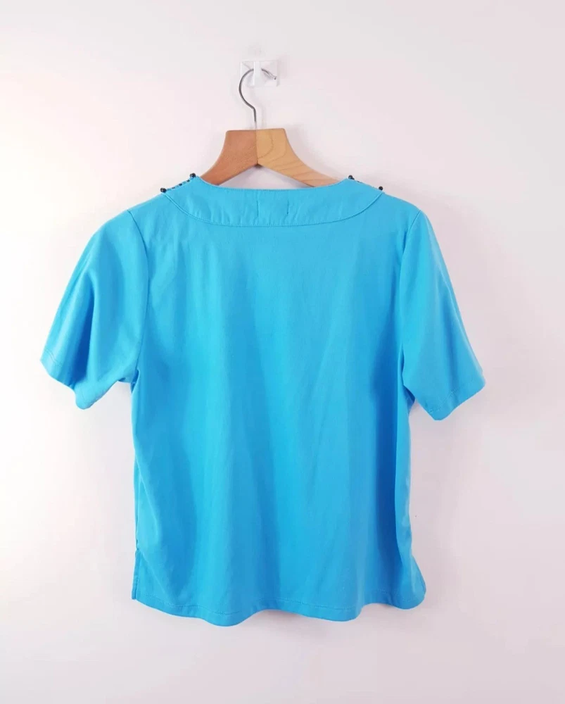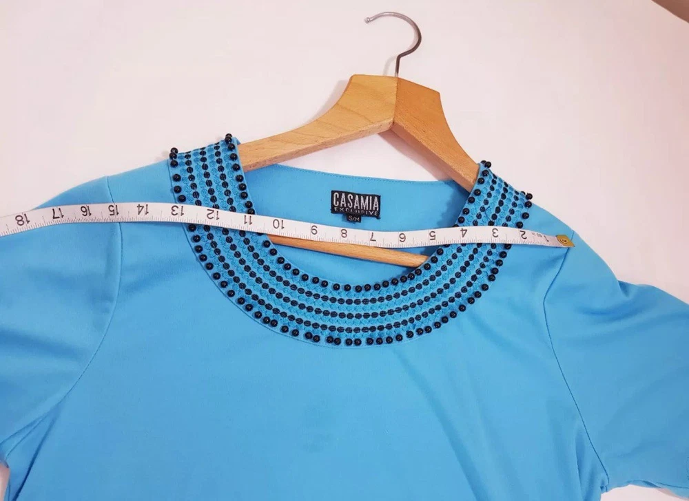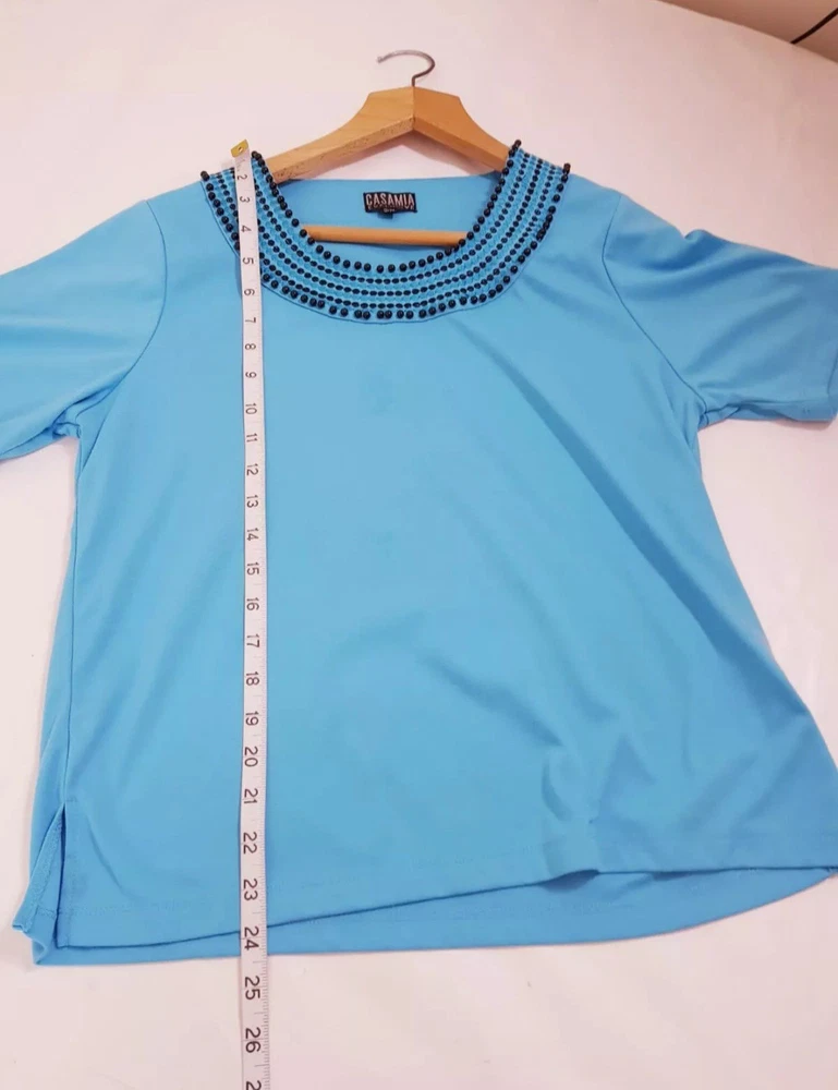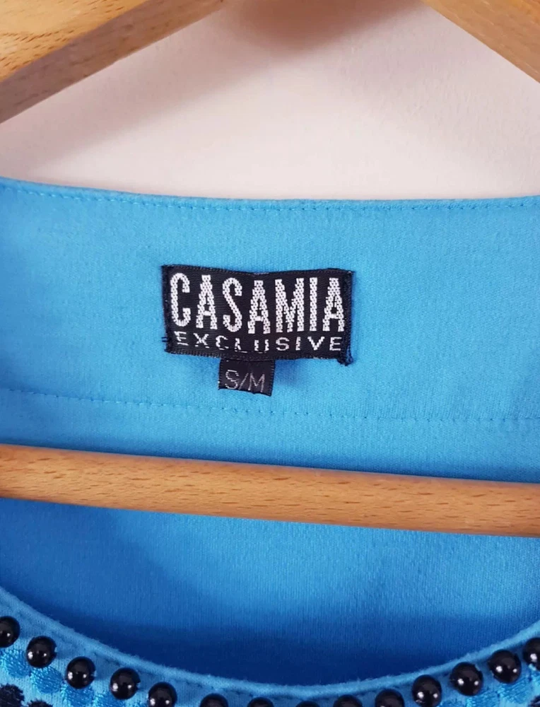 Casamia Exclusive blue T-shirt in size S/M with short sleeves. Made of polyester and viscose, this limited edition top features a basic style in a jersey fabric. Designed and manufactured in the United Kingdom, this preloved item is a stylish addition to any woman's wardrobe.