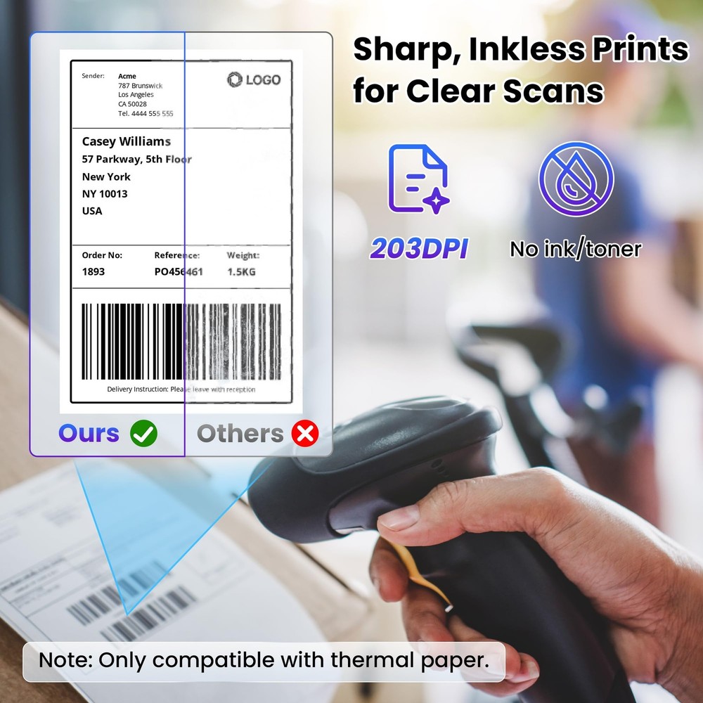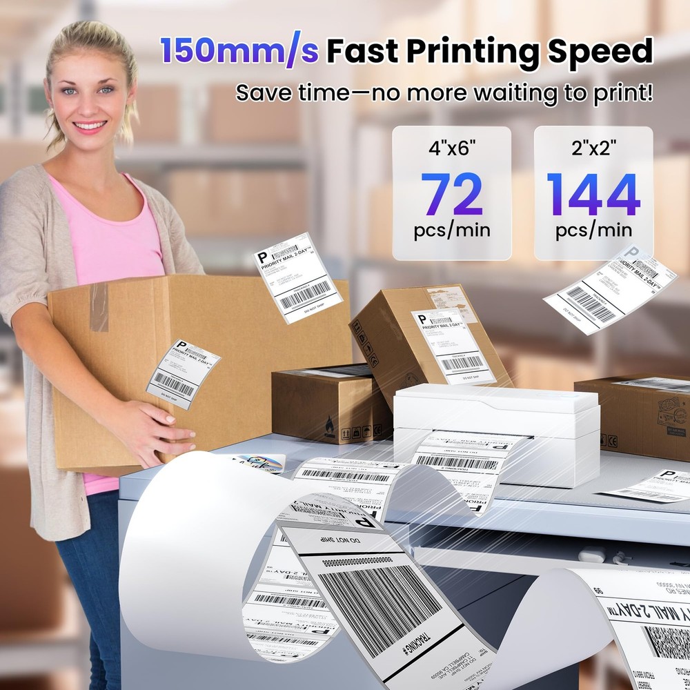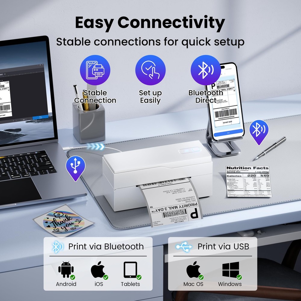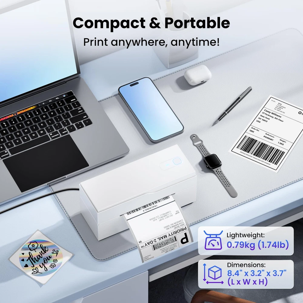 Transform your organization game with this versatile label printer designed for both home and office use. This efficient printing companion helps you create clear, professional-looking labels for files, storage containers, shipping packages, and more. With its compact design, it fits perfectly on any desk while delivering crisp, easy-to-read text that stays put. Whether you're managing a home office, running a small business, or simply trying to keep your pantry organized, this label printer streamlines your labeling tasks. The printer works quickly and quietly, letting you create custom labels in various sizes to suit your specific needs. Perfect for addressing envelopes, creating name tags, organizing files, or marking storage bins, this label printer helps bring order to chaos with minimal effort. Save time and maintain a polished, professional appearance in all your organizational projects with this practical labeling solution. Effortless Connectivity: The upgraded PL70 shipping label printer features both Bluetooth and USB connectivity, ensuring smooth direct printing via Bluetooth. Download the “Labelife” app for a reliable connection that sets up in just one minute for quick and hassle-free printing Clear, Inkless Printing: Experience sharp outputs with a 203DPI resolution that requires no ink—just thermal paper! Enjoy fast printing speeds of 150mm/s, producing up to 72 labels (4"x6") or 144 labels (2"x2") per minute without any paper jams Compact and Portable Design: Weighing just 0.79kg (1.74lb) and measuring 8.4"x3.2"x3.7", this thermal label printer is designed for portability. It’s perfect for small businesses and online sellers, compatible with popular platforms like Amazon, eBay, Shopify, USPS, UPS, Etsy, PayPal, and Poshmark Versatile Label Compatibility: This thermal printer supports a range of label sizes from 1" to 4.7" (25.4mm to 120mm), including shipping labels, mailing labels, price tags, barcode labels, name tags, and more, meeting all your shipping needs Professional Customer Support: Our dedicated support team is focused on providing outstanding technical assistance for our valued customers. The thermal printer also comes with a detailed user guide to ensure a smooth setup and user experience. Please note: the printer is compatible only with thermal paper