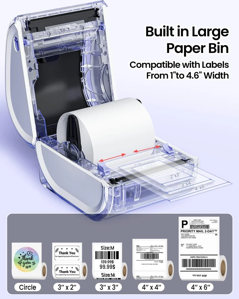 Phomemo D520-BT Bluetooth thermal shipping label printer. Product Overview - Brand: Phomemo - Model: D520-BT - Printing Technology: Thermal - Connectivity: Bluetooth and USB - Output: Monochrome - Maximum Print Speed: 150mm/s - Effective Print Width: 108mm - Printing Resolution: 203 DPI - Weight: 1.1kg - Dimensions: 175×218×157mm (L×W×H) Key Features 1. Large Built-in Paper Bin : - Equipped with a large inner paper bin, eliminating the need for a separate label holder. - Supports both fanfold and roll labels, providing flexibility in label choices. 2. Cost-Saving and Eco-Friendly : - Utilizes thermal direct technology, eliminating the need for ink or toner. - Provides a clean and environmentally friendly printing solution. 3. Wireless Printing : - Supports Bluetooth connectivity with smartphones and tablets via the "Labelife" app. - Compatible with iOS and Android devices. - Also supports USB connection for PC (Windows, Mac, Linux, Chrome OS), with driver installation required for PC printing. 4. Wide Platform Compatibility : - Compatible with major sales and shipping platforms like Amazon, eBay, Shopify, USPS, UPS, Etsy, etc. - Supports label widths from 1 to 4.6 inches, suitable for both fanfold and roll labels. - High printing speed of up to 72 labels per minute, enhancing work efficiency. 5. Advanced Technology : - Equipped with the latest AF chip and high-tech thermal print head for stable and high-quality printing. - Easy and simple operation, suitable for printing documents, photos, and more. Setup Instructions for Chrome OS 1. Connect the printer to the computer using a USB cable and turn on the printer. 2. Open the Chrome Web Store and search for "Labelife". 3. Add the Labelife extension to your Google Chrome browser. 4. Open the Labelife extension, click "Add" to discover the printer, and configure the settings. 5. Open the file you want to print in Google Chrome, press "Ctrl + P" to open the print interface, select the printer, and start printing. Benefits - Convenience : Wireless connectivity and compatibility with multiple devices and platforms make it easy to print labels on the go. - Efficiency : High printing speed and compatibility with various label types and widths ensure smooth workflow. - Cost-Effective : No need for ink or toner, reducing operational costs. - Versatility : Suitable for a wide range of applications, including e-commerce, logistics, and office environments. This printer is an excellent choice for businesses and individuals looking for a reliable, efficient, and cost-effective solution for printing shipping labels.