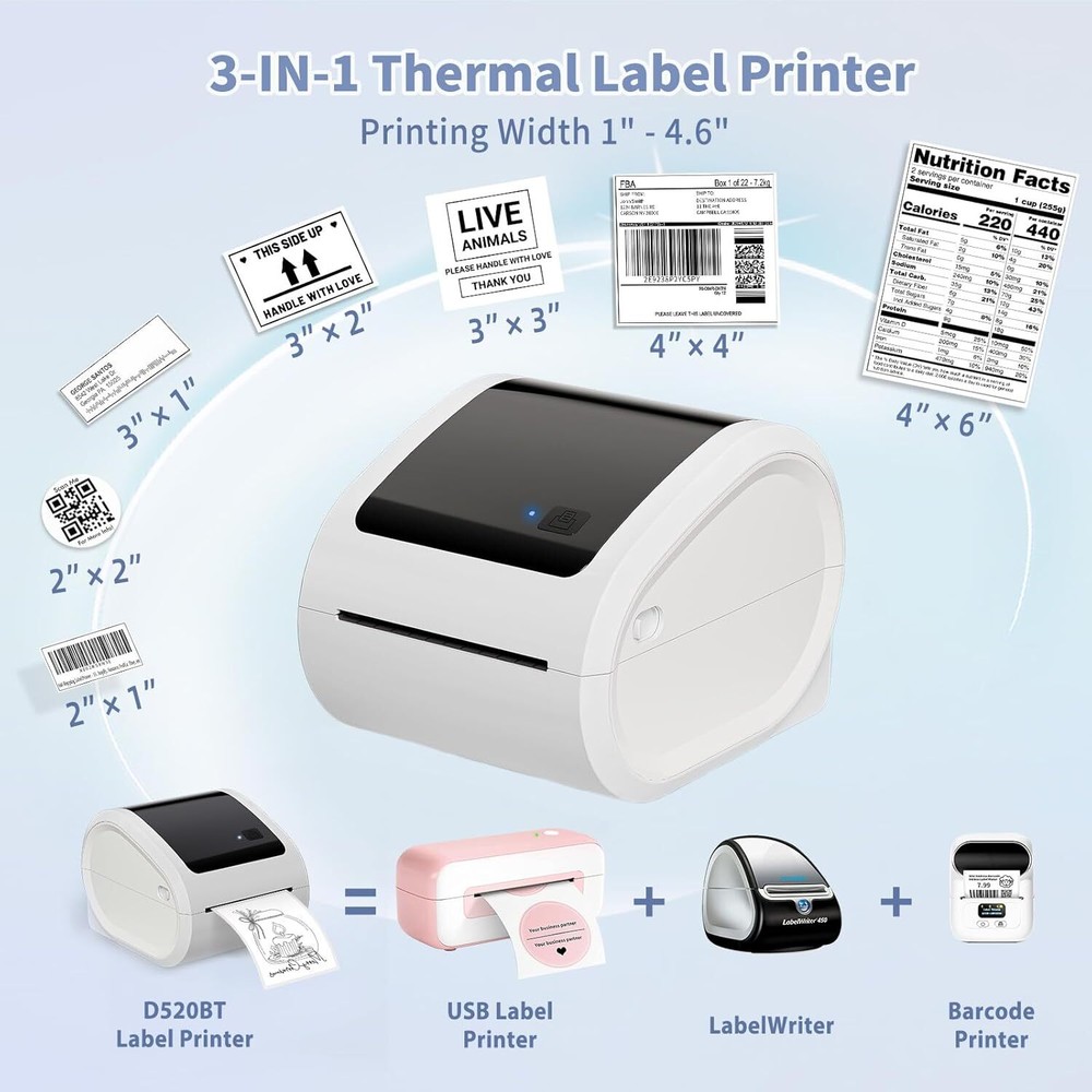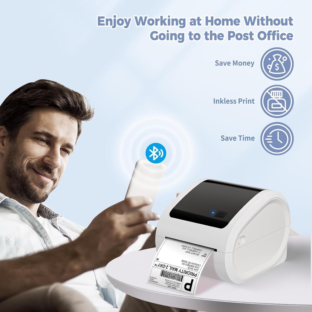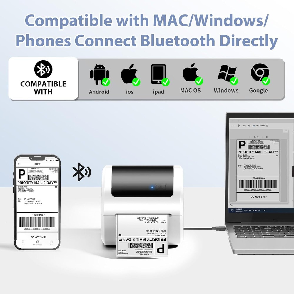 About this item [Support Bluetooth & USB Connect] This label printer for shipping packages supports Bluetooth on phones and PCs! Bluetooth is compatible with Android, iOS, macOS, and Windows systems. Note: All devices must connect via the free app. Additionally, if you prefer USB connection, this wireless thermal printer supports all computer systems including Chrome OS. (Compatible with "Labelife" APP) [Flexible Platforms Compatibility] This thermal label printer for small businesses supports label widths from 1" to 4.6". The wireless label printer is compatible with virtually all platforms, including USPS, UPS, eBay, Etsy, Shopify, Amazon, PayPal, Poshmark, Square, BigCommerce, Mercari, Wix, and more. (For all platforms, please download labels from the respective platform and upload them to the editor app for printing.) (Compatible with "Labelife" APP) [New Design Bluetooth Label Printer] The new style shipping label printer (4x6) features a larger paper bin design and is unique in the market. It supports roll paper loaded inside and fanfold paper loaded from the back. Multiple loading options help keep your desktop tidy and enhance your work experience. [Thermal Printer & Money Saver] This thermal shipping label printer uses thermal technology that requires no ink or toner, minimizing maintenance and reducing ongoing costs. The paper bin design eliminates the need for a label holder, saving time and space. The stable Bluetooth connection works within 5-8 meters. [Easy to Set Up] Setup takes only one minute. Detailed video and manuals are available on the official website for easy setup. Product dimensions: 7.1 x 8.86 x 6.65 inches