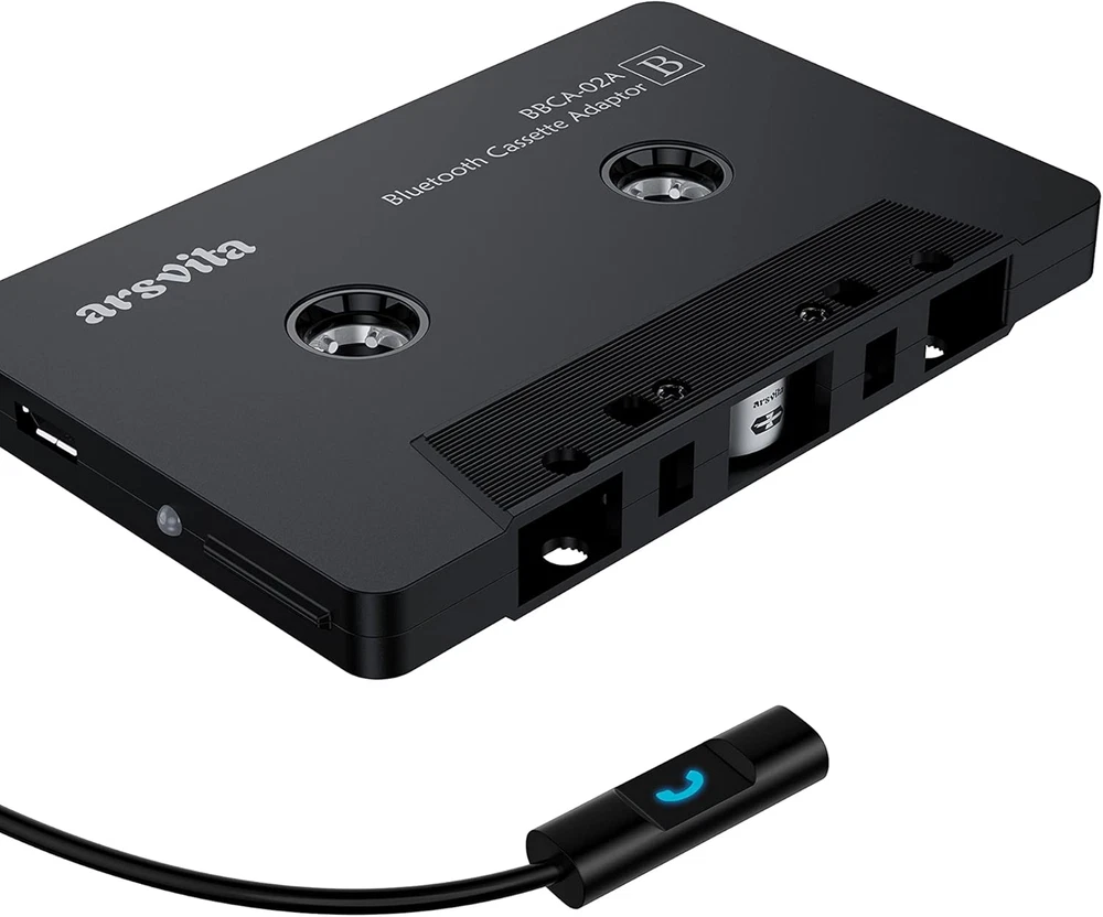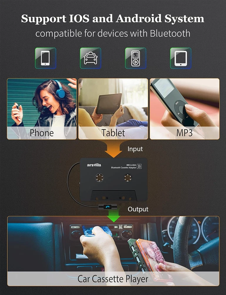【Why do you need me?】When you have a vintage car with a tape player, the cassette Bluetooth receiver will let you continue to enjoy the music on your phone! You don't need to replace or refit your car to avoid destroying his original classic! 【 Premium Sound Quality for Music】The Arsvita Cassette Bluetooth 5.0 receiver is compatible with most smartphones and is ideal for home or car audio systems. This is a box-type Bluetooth receiver for cars or devices that don't have Bluetooth and want to receive Bluetooth signals.Just adjust the audio equalization settings on the player and you'll get the music classics! 【 Easy Control for Music】You can answer phone calls or control music on the receiver. Play / Pause music, answer calls. Support any phones, tablets, MP3 players, car stereo, headphones, Hi-Fi, portable speaker or other devices equipped with standard Bluetooth tech . Seamlessly transmits stereo audio for high quality sound, making you enjoy your music anywhere and anytime! 【 Extra-Long Play Time 】Built-in battery provides up to 8 hours’ play and talk time, 168 hours’ standby time, only takes 1.5 hours to fully charge it.Premium Chip supply more stable and faster transmission with less power consumption, which can represent a superior audio performance to spoil your ear and never feeling boring while driving. 【What You Get】1 Pack Bluetooth 5.0 Receiver Cassette adapter. Product manual and customer service card. 12 Months Replacement if there is any dissatisfaction with our Bluetooth 5.0 Receiver Cassette adapter, please contact us firstly. Product description Arsvita Cassette Adapter for Car Bluetooth Generation Product Features: Bluetooth 5.0 wireless connection, you don't have to worry about the problem of winding. Compatible with most mobile phone models. Hands-free Call. Press once to answer or hang up. Press twice to call back. Super long battery life. 8 hours of continuous use on a single charge. Sound quality is clear. Stable transmission. No noise troubles. Stereo sound. Classic without sacrificing quality enjoyment. Music is a must on the road. Time to liven up your classic cassette player! Bluetooth 5.0 stable transmission First of all it is not difficult to connect. Search for "Arsvita" cassette device on your phone, after the first successful pairing, it will automatically pair with your device in the future. Wireless connectivity can bring us a lot of convenience. We no longer have to worry about all kinds of wires getting tangled together. And it can be paired with more devices. Not limited to 3.5mm audio jacks. It can be paired with Bluetooth-enabled devices such as mobile phones, MP3s, tablets, etc. , and transfer the wonderful music from the device to the cassette player. Don't waste your stereo The stereo cassette head used in the product can realize the stereo surround sound effect on the stereo equipment. We don't want to limit ourselves to the traditional flaws of classic cassettes. Now that we've got our cassette connected to our mobile music library, let's make it a little better. Therefore, we use high-quality materials from both the shell and the components. To make it worth. The build-in Microphone The small function buttons can give the product more important functions, that is Call and voice assistant . It will be more practical while you are driving. For example, when there is an incoming call, you can press the button to connect, and then press it again to hang up. You can also use it to pause or play music . For example, you can call up Siri to have it announce the weather, answer calls, announce navigation, and more. This is a unique feature of this product! Long Play Time Only takes 1.5 hours to fully charge the Built-in battery which provides up to 8 hours’ play time. Compatible with Most Bluetooth Devices Bluetooth 5.0 wireless connection. Compatible with most smartphones and is ideal for home or car audio systems. Superior Chip Supply more stable and faster transmission with less power consumption.