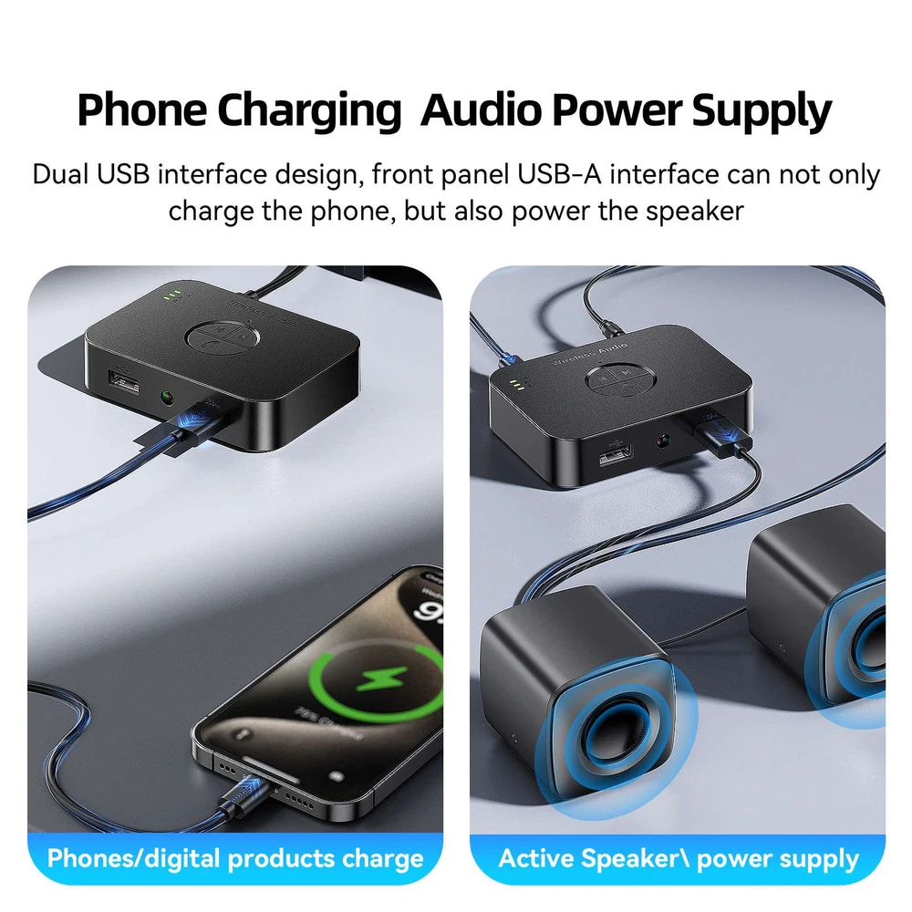 Product Description Features: Bluetooth Receiver for Home Stereo: Bluetooth receiver is the perfect Bluetooth adapter for stereo receivers. It allows you to stream music from your phone/tablet/laptop directly to your home stereo/old speakers/car stereo/projector. Whether you have a modern or old setup, it is the ideal Bluetooth adapter for old stereos. This product is a receiver only, not a transmitter Bluetooth 5.4: This Bluetooth music receiver utilizes the latest Bluetooth 5.4 technology to deliver superior sound quality. You get an excellent listening experience with crystal clear, high fidelity music that fills the room with sound Dual USB Interface Design: The front panel is equipped with two USB interfaces. The left USB supports USB flash drive playback, while the right USB is designed for charging digital devices such as mobile phones. With one device serving two purposes, it eliminates the need for an extra charger and simplifies your desktop Easy Setup: This Bluetooth receiver is very simple to use. Plug in the Type-C power cable, connect it to your home stereo with the provided cable, and then pair it with a Bluetooth audio device such as a smartphone or tablet. After that, you can enjoy the music Connect Multiple Devices: It pairs with smartphones, PCs, tablets and supports 2 connections at the same time. (Note: You need to pause the audio of the first step phone before playing the audio of the second part) Connect 2 old speakers via AUX, RCA to synchronize your music at home, it also supports USB drive playback, our device can quickly convert your speakers to Bluetooth speakers to bring you a consistent audio experience Remote Wireless: The Bluetooth stereo receiver also provides you with a range of up to 65 feet and a stable transmission, allowing you to move around your home freely without losing connection Batteries not included: No built-in battery, requires continuous power (Type-C cable included), you never have to worry about stopping working due to low battery power. Specifications: Bluetooth version: 5.4 Power supply: Type-C Port Product interface: RCA/AUX/Type-C/USB Bluetooth protocol: A2DP/AVRCP/HFP/HSP USB disk format: MP3/FLAC/WAV/WMA etc Package includes: 1x Bluetooth Receiver 1x AUX 3.5mm Audio Cable 1x RCA Audio Cable 1x Type-C Charging Cable 1x Remote Control Shipping 1. Items sent from US warehouse. 2.Receiving time = Processing time + Shipping time . 3. Processing Time: Around 1-2 business Days . 4. Shipping Time: 3-5 business day. it may have a little delay during some holiday (such as Christmas), any problem, please feel free to contact. Returns 1. 30 days warranty from the purchased date. Please contact us via email before returning the defective item. 2. Our warranty does not extended to any product that are physically damaged or that are not under normal operating conditions as result of misuse or improper installation on the buyer/user's part. 3. Return items should include the original packaging and all accessories. buyers MUST contact us for the returning address. 4. In all cases, buyers pay shipping fees at their own cost to return products for exchange or refund. We will be responsible for the postage of replacements. Refund will be made upon receipt of the returned item. Contact Us If you have any question, please e-mail us immediately, we will reply you as quickly as possible. We care about our valued customers, and will always try to help you. About Us We are committed to providing you with the best quality products and services. We hope your shopping experience is easy and enjoyable. Payment We accept all verified payment from eBay. powered by