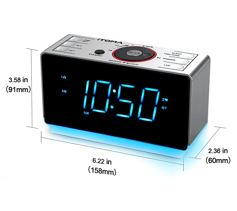 BIG BRIGHT DISPLAY & FM RADIO: Large 1.4-inch ice blue LED display with no flashing light makes the time easy to read from afar. FM Radio with 20 programmable preset stations. External FM wire antenna gives better radio reception. DUAL ALARM:This digital dual alarm is designed to cater to your unique scheduling needs. Easily set 2 distinct alarms with radio or buzzer wake-up and 15-level volume controls. Choose from 4 week modes: every day, single day only, weekdays only, or weekends only. Features a 9-minute snooze function, repeatable up to 6 times to ensure you wake up on time. MANUAL / AUTO FM RADIO: Easy Tuning FM Radio with 20 programmable preset stations. Choose a station from 87.5MHz to 108.0MHz as you want and listen to your favorite FM radio station. External FM wire antenna gives better radio reception. Also, it allows you to set a sleep timer from 10 to 90 minutes when playing the radio and can automatically shut down by itself. ULTRA CLEAR DISPLAY: The alarm clock's 1.4-inch ice blue LED display screen shows the time in large and ultra-clear numbers, makes it easy to read from across the room at any angle. 4 levels manual and auto brightness allows you to see the time clearly anytime. 2-level warm night light creates a warm feeling at night without disturbing your sleep. TIME DESIGN: This versatile alarm clock radio combines functionality with convenience, easy to set time, date, and year. You can select 12/24 hour display or turn DST on/off according to your preference. BLUETOOTH : Our alarm clock offers seamless Bluetooth connectivity with your smartphone. The device also features a headphone jack, so you can simply plug in your headphones and enjoy your music or radio without any external interference. CONVENIENT AND USEFUL ADDITIONAL FEATURES: Memory function prevents power failure or AC line being disconnected by mistake, you will never have to worry about resetting your alarm clock. The USB charging port is specifically designed for charging your mobile device.