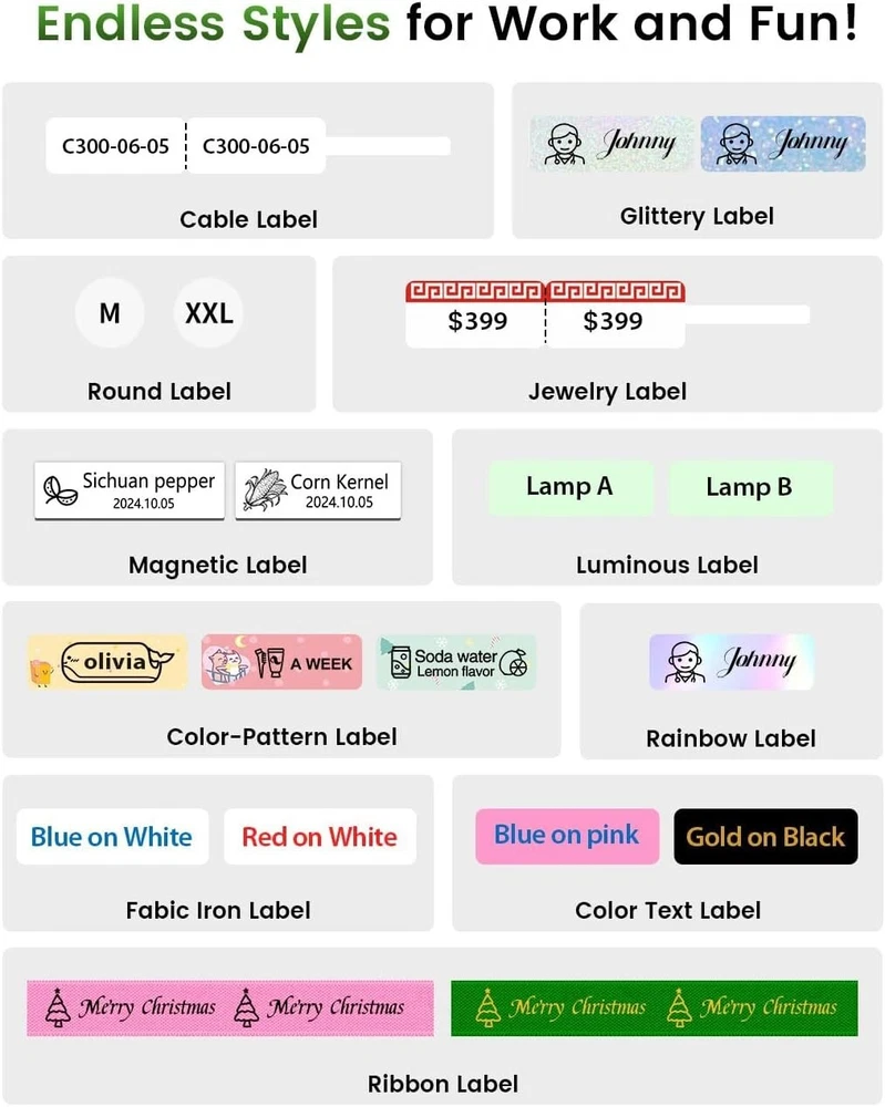 Label Printer, A30 Thermal Transfer Printing Bluetooth Wireless Portable Small Label Maker Machine, Mini Sticker Printer Rechargeable for Wrapping Decorations, Cloth Name Tag, in/Out Door Use Exceptional Performance and Durability: The A30 mini label maker truly excels with its remarkable performance and outstanding temperature resistance. It can operate flawlessly in extremely diverse temperature ranges, from bone-chilling to intensely hot. Its remarkable water and oil resistance ensures that the labels remain clear and highly durable, whether in outdoor environments or harsh conditions like dishwashers, it significantly broadens the scope of its applications Convenient Operation and Intelligent Connectivity: The A30 bluetooth label machine is a paragon of convenience, boasting a compact and portable design along with a user-friendly interface. Through wireless Bluetooth technology, it achieves ink-free color printing. Simultaneously, it automatically recognizes the size and type of consumables, streamlining the printing process and greatly enhancing work efficiency Abundant Creative Features and Templates: This label-making software is a treasure trove of features and templates, enabling users to effortlessly create highly personalized labels. These labels can incorporate various elements such as text, QR codes, barcodes, images, and time. With an extensive selection of 200 built-in fonts, 600 symbols, and over 200 border material templates, users can readily customize unique and captivating labels Diverse Label Types for Personalized Needs: The A30 support pre-cut or continuous labels, patterned labels, refrigerator magnetic labels, colored font labels, ribbon, fabric iron-on labels, premium glitter labels, and Luminous labels. This extensive Label support means that the A30 can meet an extensive array of needs, ranging from home to industrial applications. Whether it's labels that require durable use or those that demand special visual effects, the A30 can provide the perfect solution The A30 labeler has a broad range of applications covering various fields: In the home, it can be used for gift decoration, journaling, clothing organization, food storage, cosmetics identification, and mail sorting. In the office, it serves as a powerful tool for organizing notebook labels, price tags, reminder labels, and identifying other office supplies. In schools, it is a label-making tool for teachers and students, used for identifying learning supplies, personal items, and name labels Fun Gift for Your Lover The perfect way to warm hearts and spread joy this holiday season!