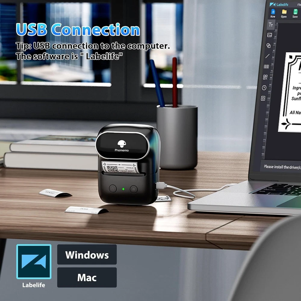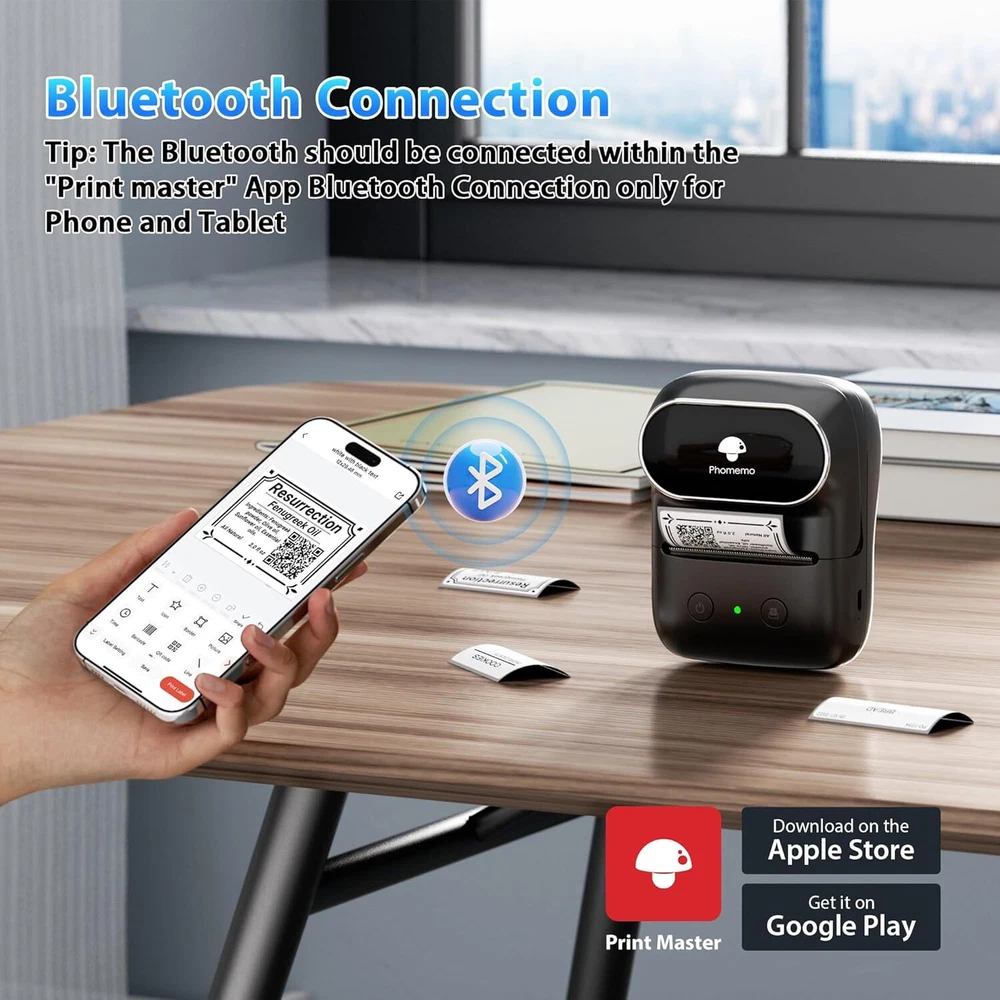 Product Description Phomemo M108 Label Maker Machine-Barcode Label Printer, Portable Sticker Maker for Price Tag, Logo,Address, Mailing, Home, Office & Small Business, Compatible with Phones&PC Product Specifications Product Name : Easy to Use Label Maker Printer - Mini Bluetooth wireless thermal mobile label printer Connectivity : - Bluetooth: One-click connect and printing - Bluetooth Version: 4.0 - Range: Up to 33 feet (10 meters) - Connection Time: Approximately 5 seconds Compatibility : - Devices: Mobile phone - Supported Systems: Windows / Mac OS / Chrome OS Printing Technology : Thermal Brand : Phomemo Label Templates : - Variety: Yes - Customizable: Yes - Types: Clothing labels, price labels, cable labels, jewelry labels, address labels, folder labels, etc. Label Width Range : 20mm~50mm Max Printable Width : 48mm Printing Performance : - Output Type: Black - Print Media: Labels - Resolution: 203dpi (8 dots/mm) - Ink-less: Yes - Smooth & Fast Printing: Yes - Adjustable Paper Holder: Yes - Batch Printing: Yes Powerful APP : Print Master OCR (Optical Character Recognition) : - Recognition Time: 5 seconds - Function: Convert text in images directly into editable text Additional Features : - No Ink Printing: No need to use ribbon - Only print black and white Package includes: 1 x Pocket thermal printer 1 x USB Cable 1 x Roll Label (size:40x30mmx100pcs) 1 x User Manual 1 x Packing Box