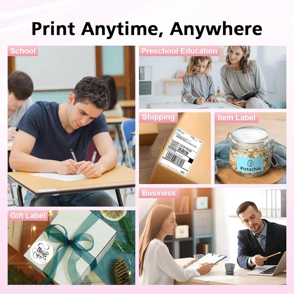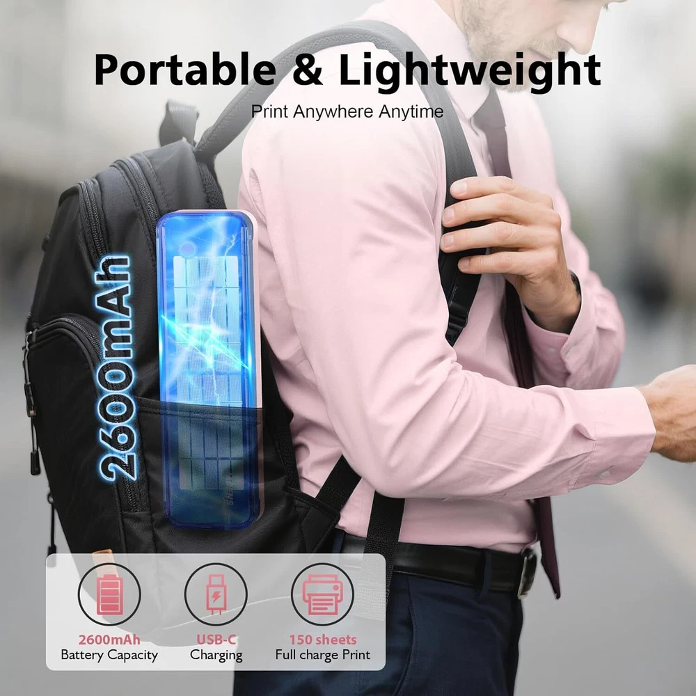 About this item [Comes with 6 Paper Rolls + Multi-Size Support]: Portable thermal printer includes 6 thermal paper rolls (US Letter, 4 × 6", 3" and 2"). Printable documents, shipping labels, product labels, and gift labels. Supports single, spacer, and continuous paper (Note: Gap label needs to be learned before use). [4-in-1 Versatile Printer]: One printer functions as four. The mobile printer can print documents for all ages, print 2/3-inch labels to organize kitchen items and personal materials, and quickly print shipping labels for online orders. Saves space without changing printers, meeting home printing needs. [Wide Device Compatibility]: This compact printer connects wirelessly via Bluetooth to smartphones, tablets, and laptops, or uses a USB cable for computers. The accompanying app delivers advanced creative tools for printing—no cost, no limits. (Note: Mac computers need to be connected via USB.) [Inkless Printer]: Thermal printing technology requires no ink, ribbon, or cartridges—eliminating ink blockages and cleaning issues. Each thermal paper roll costs only $0.7, cheaper than traditional printing. (Note: Only supports thermal paper, not regular copy paper.) [Ultra-Portable & Long-lasting Battery]: Weighing only 1.5 lbs with dimensions of 10.4 x 1.89 x 3.15 inches, this lightweight and compact printer is ideal for travel and on-the-go use, fitting easily into backpacks or briefcases. Built-in 2600mAh battery ensures extended use without frequent recharging. Product dimensions: 10.4 x 1.89 x 3.15 inches