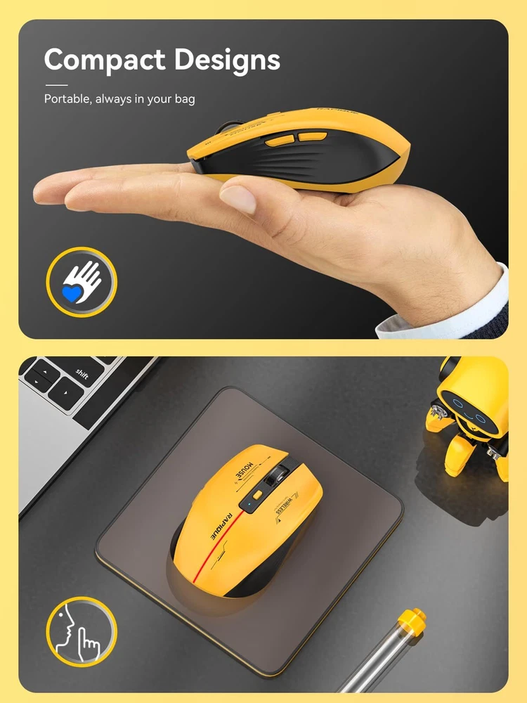 INNOVATIVE MECHA STYLE DESIGN - Experience the unique yellow and black combination that will captivate your senses, Meticulously crafted with utmost precision, this wireless is a visual delight and makes for a perfect gift choice SEAMLESS CONTROL OF 3 DEVICES - Seamlessly switch between three devices with our dual Bluetooth 5.1 modes and wireless 2.4G technology. A simple click of the mode switch button located at the bottom of the allows you to effortlessly transition from desktop to , laptop to Macbook, iPad, and more. The green, blue, and red indication lights represent BT1, BT2, and 2.4G USB respectively, ensuring easy and convenient device connectivity RECHARGEABLE & AUTO SLEEP FUNCTION - Say goodbye to battery replacements with our convenient USB to Type-C cable charging. Fast and stable charging ensures you are always powered up. Embrace energy efficiency and environmental friendliness. After 1.5 minutes of inactivity, the automatically enters sleep mode to conserve power. A simple click of any button or movement of the wakes it up instantly SILENT CLICK & HIGH RESPONSIVENESS - No more worries about disturbing others with noisy clicks. Our noiseless reduces noise by up to 90%, providing a silent working environment. With 3 adjustable DPI settings (800, 1200, and 1600), enjoy precise and sensitive cursor movement for enhanced productivity COMFORTABLE & COMPACT DESIGN - Designed for ergonomic comfort, this features an elegant profile that fits perfectly in your hand. With 6 buttons, including 2 convenient forward and backward buttons on the left side, it caters to both work and gaming needs. Tested for durability with over 5 million clicks, this ensures long-term stability WIDE COMPATIBILITY - with Windows 8/10/11, Android, and Mac OS systems via Bluetooth 5.1. For devices without Bluetooth capability, simply insert the 2.4G USB receiver for seamless connectivity. Works with desktops, laptops, PCs, Macbooks, Chromebooks, and Surface , providing versatility and convenience Note: 1. Bluetooth 5.1 supports the ios system for both iPad and iPhones, but the ios system has to be ios 14 or later version; 2. Long press the top DPI button to turn off the decorative light, and long press again to turn on it