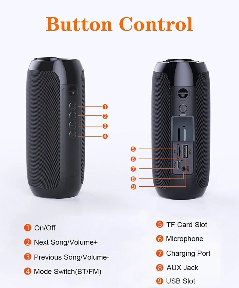 eBay Product Features: Using advanced Bluetooth audio decoding chip, support all Bluetooth device connection; Support FM radio, you can directly search the radio station in the listening area; the tone is soft and clear and dynamic, each level is distinct; Direct reading of TF card and U disk; Bluetooth receiving distance can be as long as 10 meters. Support LINE IN audio input, provide you with computer speaker function. Can be directly connected to mobile/tablet/and TV Bluetooth pairing to play music; In the state of no Bluetooth connection, automatically shut down for half an hour. Specifications: Color: Black Support: FM, TF card input, U disk input, 3.5mm audio input Bluetooth version: Bluetooth 5.0 Wireless transmission range: <10M/33Ft Audio noise ratio: ≥90db Battery capacity: 1200mAh Built-in voltage: 3.7V Normal volume playback: 3H~5H Speaker specifications: ¢45mm*2 Speaker power: 4Ω/5W*2 Frequency response: 120HZ-20KHZ Product size:68.8*68.8*160mm Stand-alone weight: 330g Charging voltage: 5V/500MA Extended memory: 32G(Not included) Material: ABS, mesh Waterproof level: IPX5 Package Included: 1 x Bluetooth audio 1 x Neutral specification 1 x USB data cable 1 x Audio cable