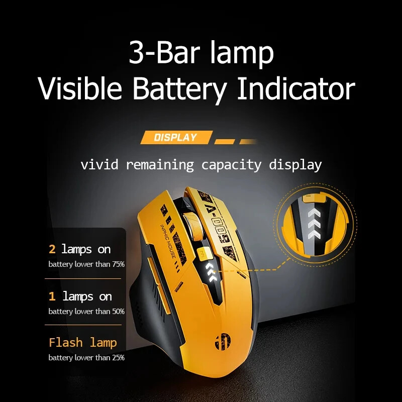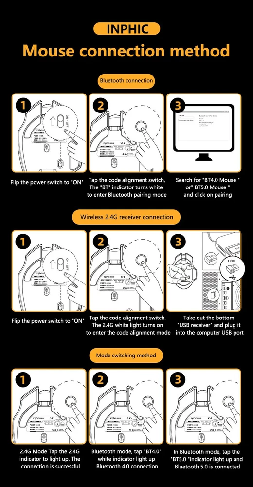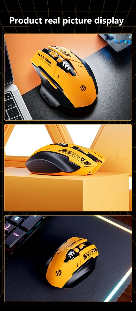 Product parameter Product size: 118*79*40MM Product weight: 100G±5G Connection method: 2.4G wireless + Bluetooth 4.0 + Bluetooth 5.0 DPI: 800/1200/1600/2000/2400 Wireless carrier frequency: 2402-2480MHZ Rated working current: ≤8MA Charging input: 5V500MA Battery capacity: 500MAH Chip: PIXART 3212 Number of keys: 6 keys Operating system: WINDOWS XP and above series, suitable for universal mouse system(Windows 7 systems and below only support 2.4G wireless receiver connections) Powerful chip, PIXART 3212 Using the high-precision chip PIXART 3212 from the famous manufacturer, it is faster and consumes less power, and its performance can be fully released. It can achieve more precise movement whether in office or entertainment. Bluetooth three modes, can be used on a variety of devices The three Bluetooth modes are widely compatible and can be used on computers and tablets. It supports wireless 2.4G, Bluetooth 4.0, and Bluetooth 5.0, and can be quickly switched between 3 devices. Five levels of DPI, freely adjustable The five-stage sensitivity of 800-1200-1600-200-2400 is freely adjustable, suitable for different scenarios, making the mouse smoother. Doubled battery capacity, smart power-saving technology It uses a 500mah large-capacity lithium battery, which is 100% higher than the previous generation. With intelligent power-saving technology and lithium battery protection technology, the battery utilization rate is further improved. Matrix energy lamp, power visualization The innovative design of the power indicator light and the sci-fi color design are more in line with the style of the mouse itself. It also has a low battery prompt to say goodbye to power outage anxiety. Regarding safety, we protect everything The mouse is equipped with a variety of protection mechanisms, including overcurrent, overvoltage, overcharge, overtemperature, short-circuit protection, etc., to ensure safety and reliability during use. wireless mouse Limited time new product discount 60-6, quantity is limited, first come first served INPHIC A9 wireless mouse Bluetooth 5.0 mouse, Bumblebee version mouse, five-level DPI adjustable, large battery and long battery life, three connection modes Powerful chip, PIXART 3212 Bluetooth three modes, can be used on a variety of devices Five levels of DPI, freely adjustable Doubled battery capacity, smart power-saving technology Matrix energy lamp, power visualization Regarding safety, we protect everything mighty mouse bluetooth mouse bumblebee mouse Bluetooth 5.0 mouse
