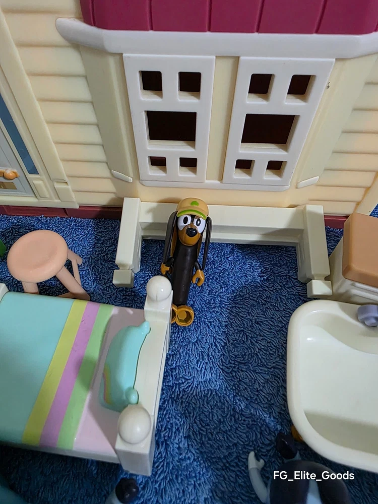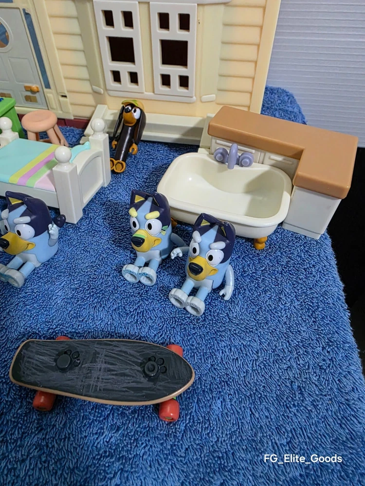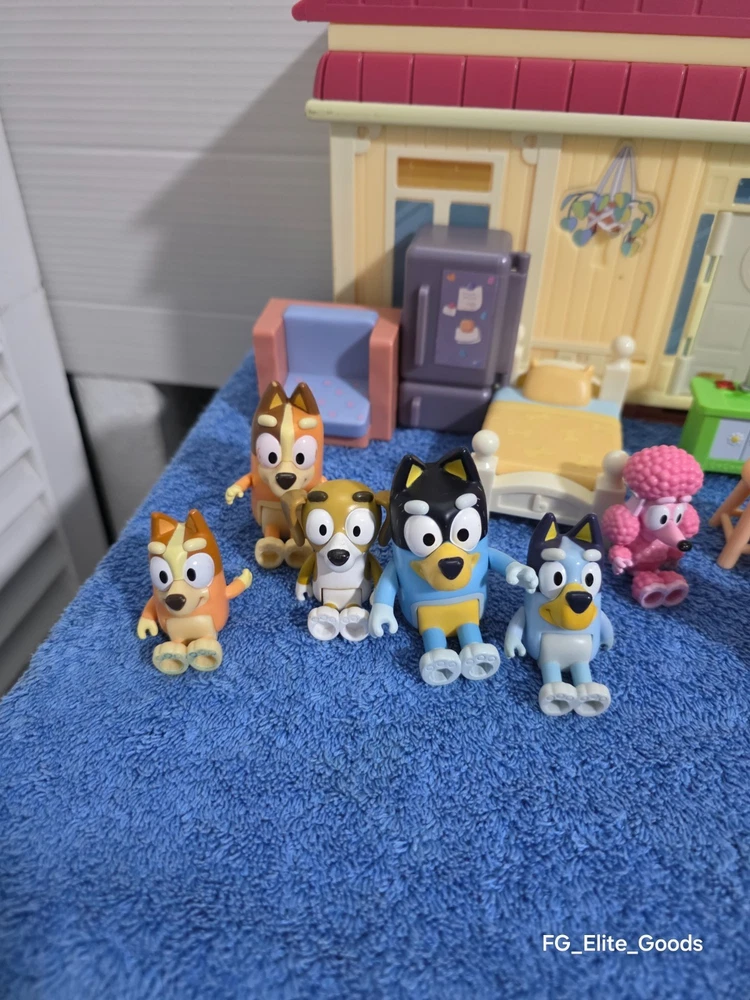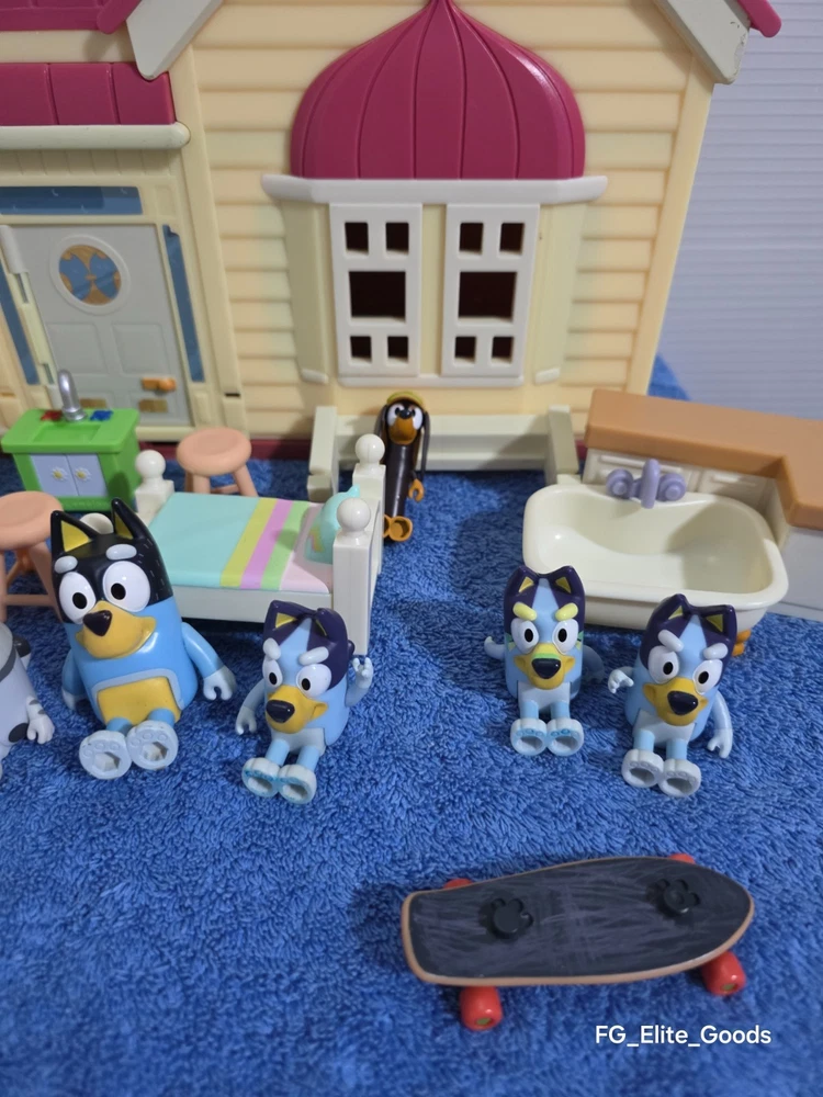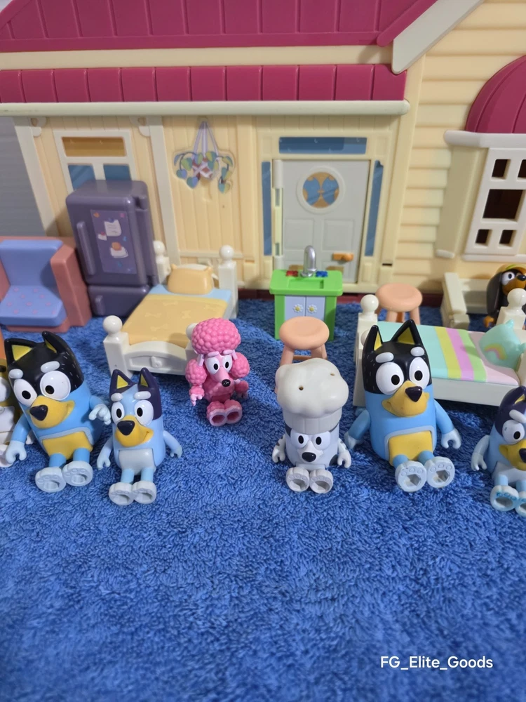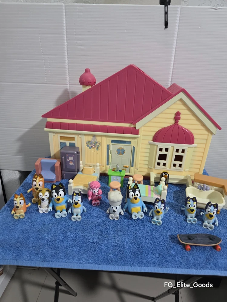 What you see is what you get Feel free to reach out with any questions or offers. The Bluey Family Home House Pack and Go Playset Dollhouse Pool Set Extra Characters is a colorful plastic playset that includes furniture and extra characters from the popular TV show Bluey. This playset, manufactured in 2018 by Moose Enterprise, is perfect for all occasions and features a cartoon and TV character theme. With its vibrant multicolor design and inclusion of beloved Bluey characters, this toy is sure to provide hours of imaginative play for children.