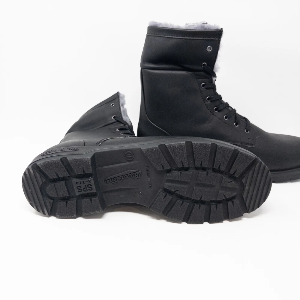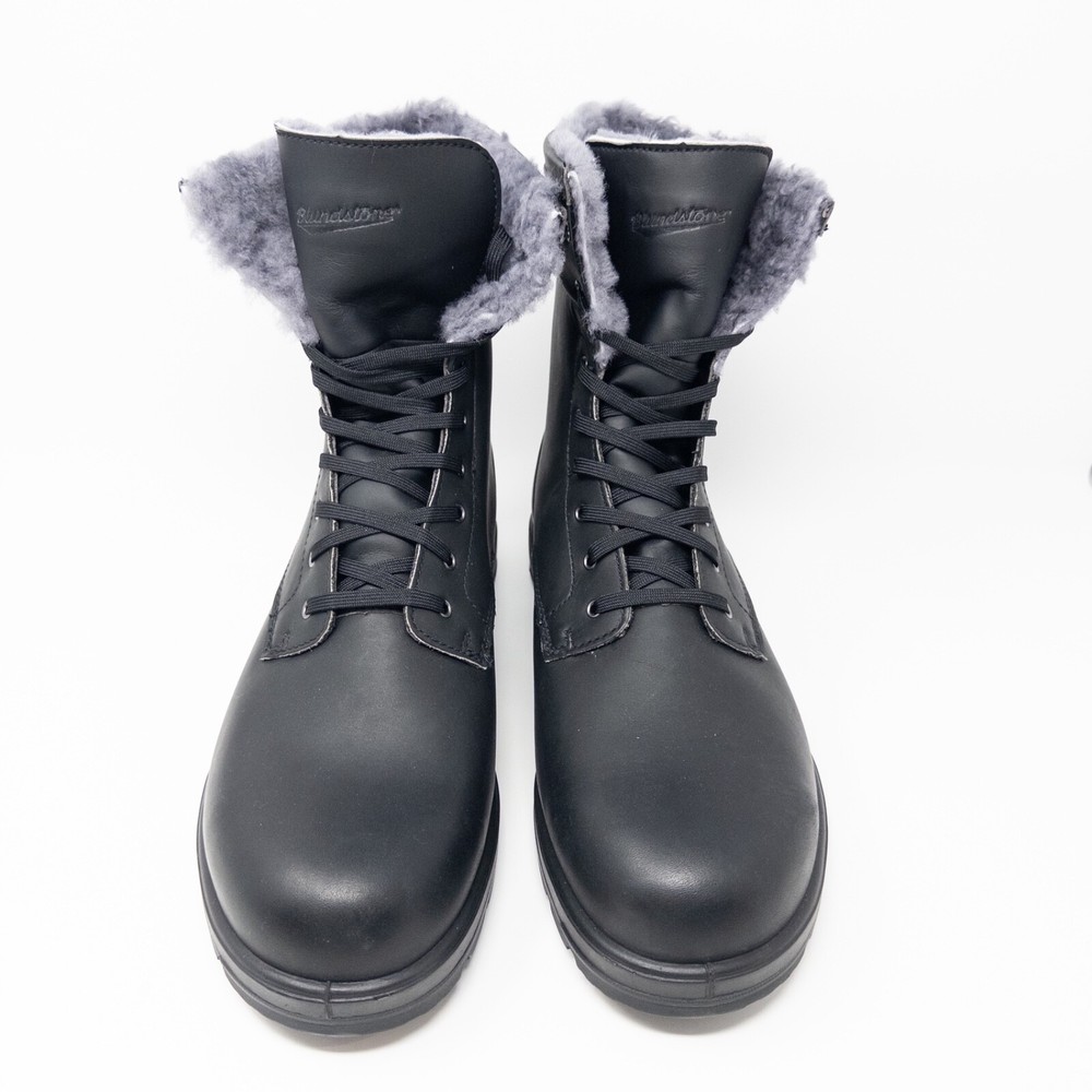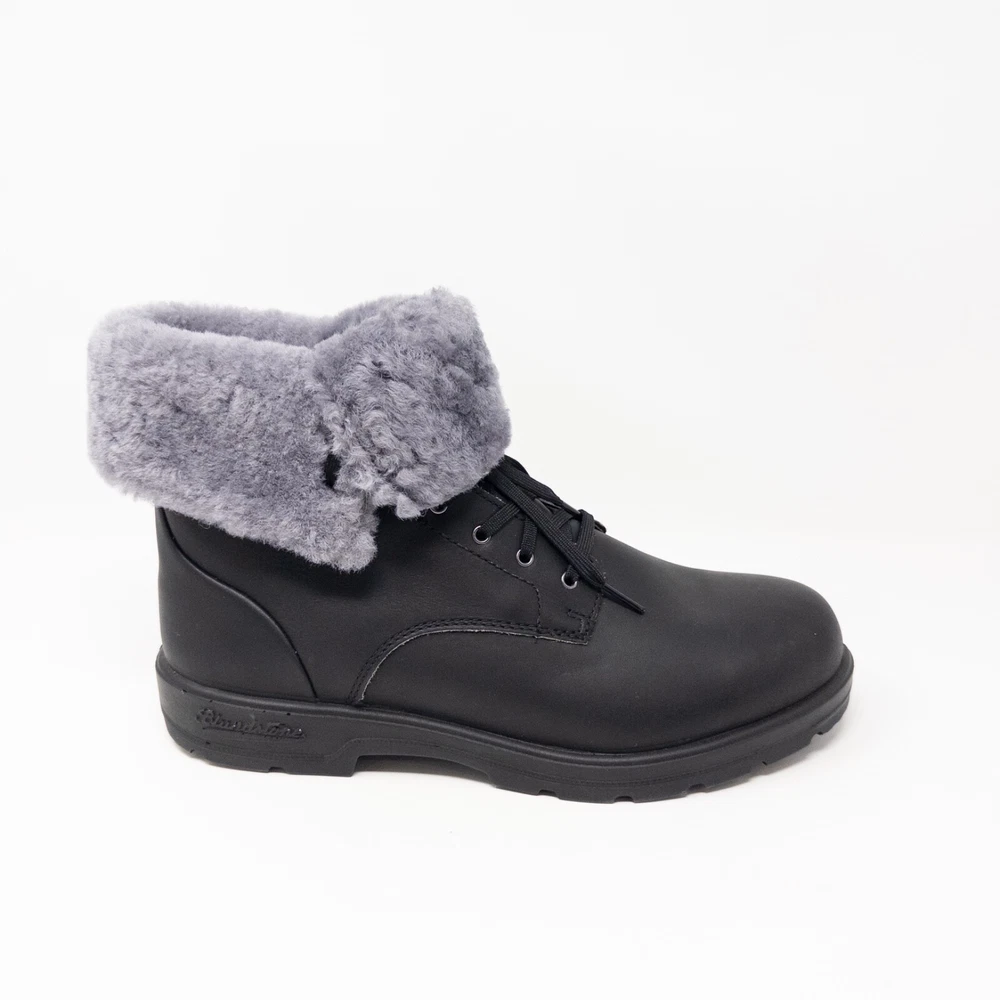 Blundstone Waterproof Shearling Lined Boots for Men. Can be worn up in a combat boot style that will fit under pants or rolled over so the shearling shows. AU 9 Fold Over Black Grey US Men’s 10 Women’s 11