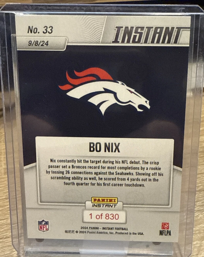 This is a Bo Nix 2024 Panini Instant #33 RC trading card, featuring the rookie quarterback for the Denver Broncos. It is a must-have for any NFL or football fan, with a print run of 830 cards manufactured by Panini. The card is from the 2024 season and is part of the Panini Instant set. The card is not autographed and comes with no league or team designations, but it is a great addition to any sports trading card collection. The Denver Broncos are the team featured on the card, and it is a great way to celebrate Bo Nix's rookie season.