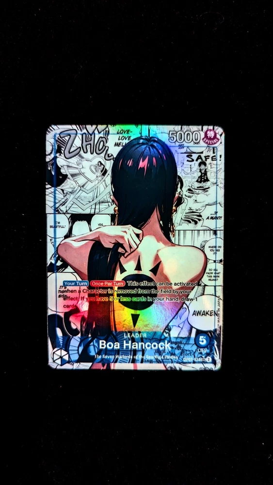 Holographic Foil Boa Hancock Leader Card One Piece Card Game Proxies Set: OP07-038 Variant: Y Card size: Standard (2.5 x 3.5 inches) Materials: Glossy Vinyl, One Piece Playing Card --------------------------------------------------------------------------- Are you a cultured and distinguished gentleman that enjoys waifus? If so, then you are in the right place! Each card is handmade, and made to order. I have experimented and choose the best materials to replicate the quality of the original card. Each card is laminated with protective vinyl (waterproof), and applied on an official One Piece Card Game leader card. I inspected every card before shipping to ensure each card is up to standard. I love each card I create and I hope you do too 💖. View my store for see all the proxies! Please contact me for any questions or concerns. Thank you! --------------------------------------------------------------------------- This is a fan-made custom card that is a parody of the actual card game.