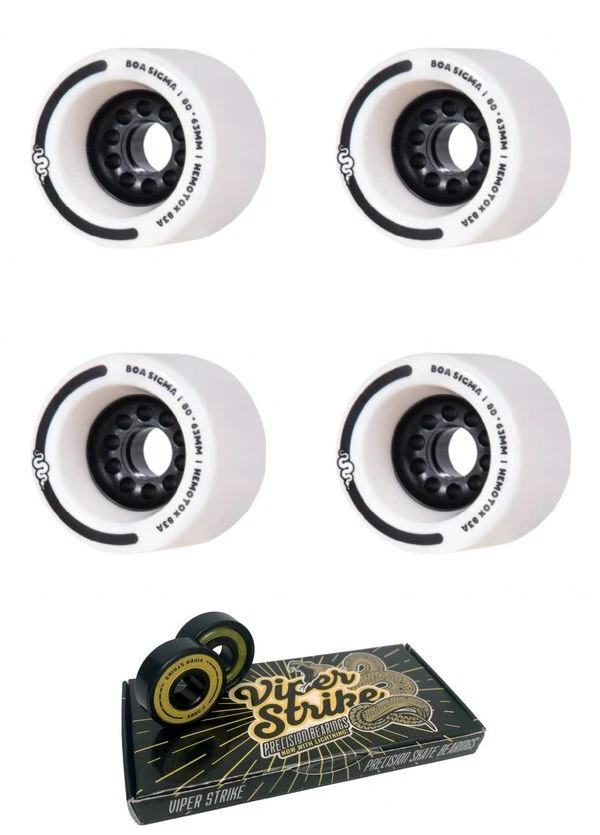 80mm Boa Wheels Sigma White Skateboard Wheels - 83a + Viper Strike Skateboard Bearings 8mm Precision ABEC 7 Skateboard Bearings These brand new Boa Wheels wheels are high-quality and made to last. They measure 80mm in diameter and 83a in hardness, and will provide a smooth ride. Features: One (1) set of 80mm 83a Boa Wheels Sigma White Skateboard Wheels - 83a (4 wheels total) One (1) box of Viper Strike Skateboard Bearings 8mm Precision ABEC 7 Skateboard Bearings (8 bearings total) Note: Bearings are not installed in wheels. Once installed, product cannot be returned or exchanged.