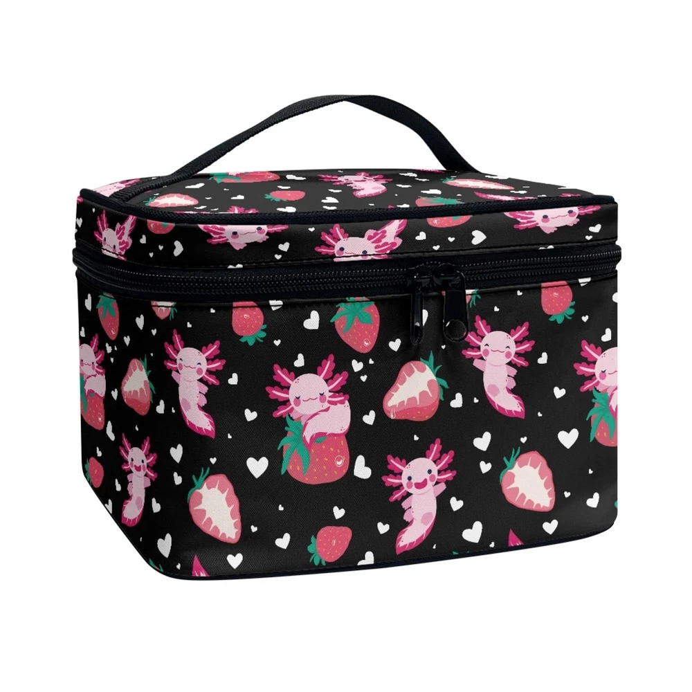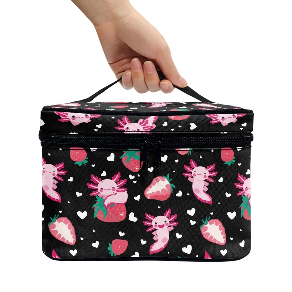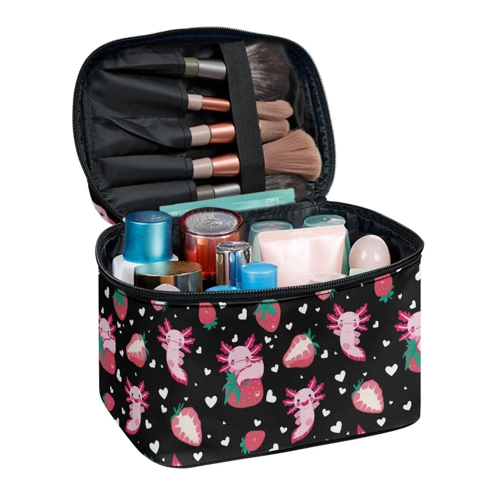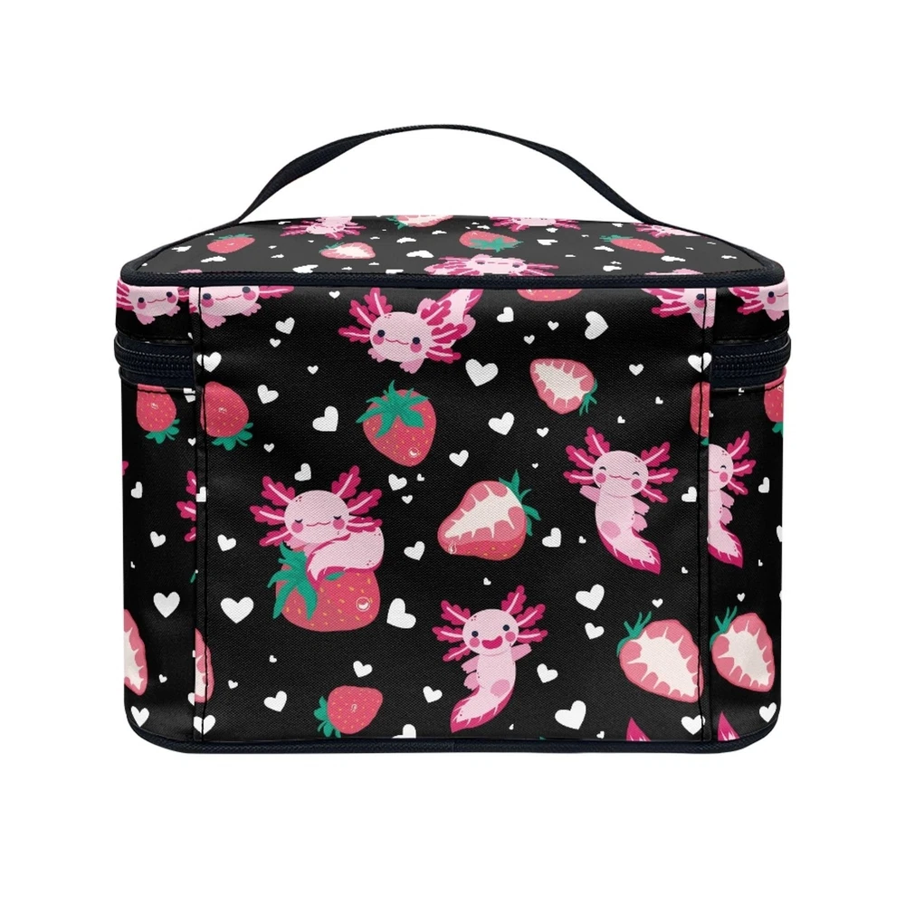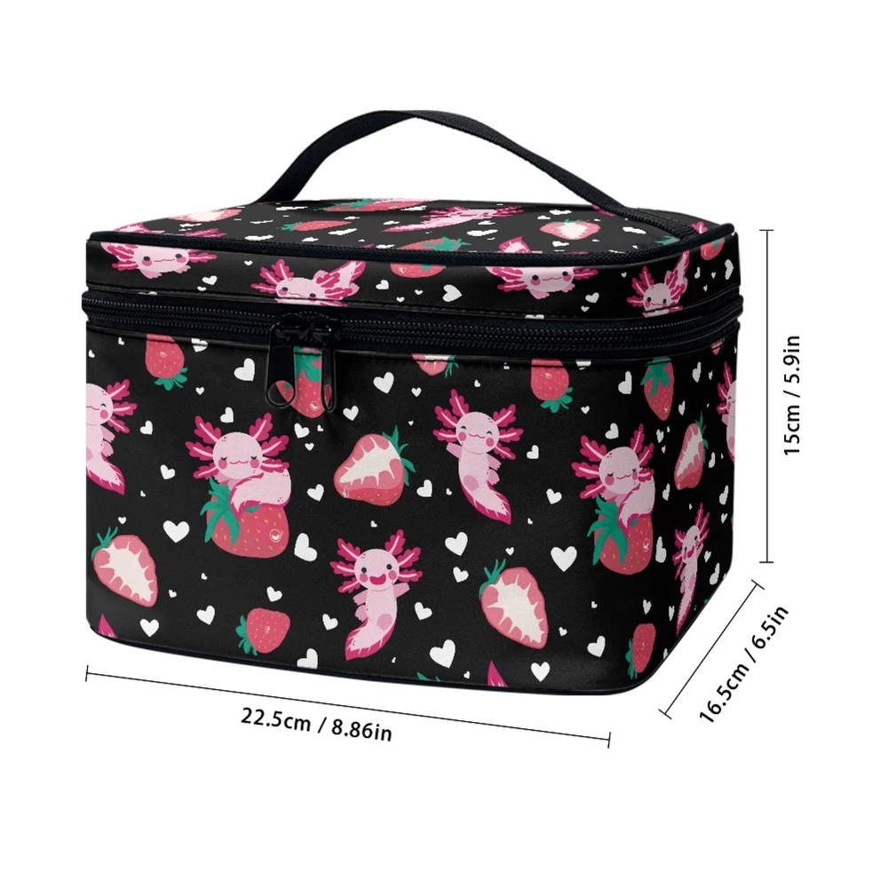 Boatee Strawberry Axolotl Makeup Bag Stylish Toiletry Bags for Traveling Women Zipper Storage Case with Handle Multi-Functional Large Capacity Cosmetic Bags for Girls Product Details Color: Strawberry Axolotl Brand: Boatee MPN: Boatee Cosmetics Bag UPC: Does not apply EAN: Does not apply Product Dimensions: 8.86 x 6.5 x 5.9 inches Item Weight: 3.52 ounces Department: Women Manufacturer: Boatee Item model number: Boatee Cosmetics Bag *Size:8.86"(W)x6.5"(D)x5.9"(H),universal fits women and girls. *Preferred Material:Make up Bag is made of high elasticity polyester,also soft and comfortable.The smooth zipper and top carrying handle make our bag more exquisite and durable,fashionable and practical.It is great for outdoor shopping,dating,working and traveling. *Features:Lightweight portable cosmetic bag style,zipper closure,moderate size and large capacity.It can be used to place lipstick,powder,loose powder and other items for convenient storage.Our cosmetic bag also can be widely used for handbag,travel bag,toiletry bag or storage organizer. *Fashion Patterns:This makeup bag with delicate and clear patterns can be personalized according to preferences to create a unique makeup bag,showing exclusive taste.It is an essential item for improving the quality of life and creating a refined lifestyle. *Great Gifts:The great gifts for Mother's Day,Valentine's Day,Birthday,Anniversary and New Year.