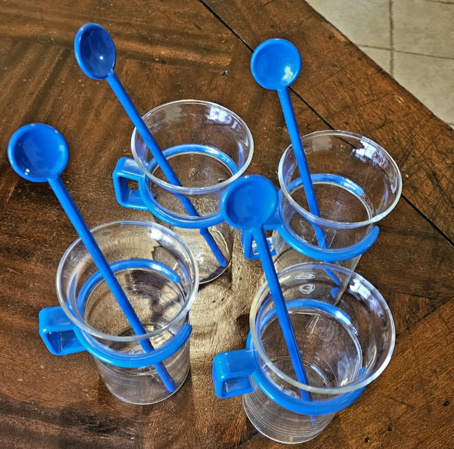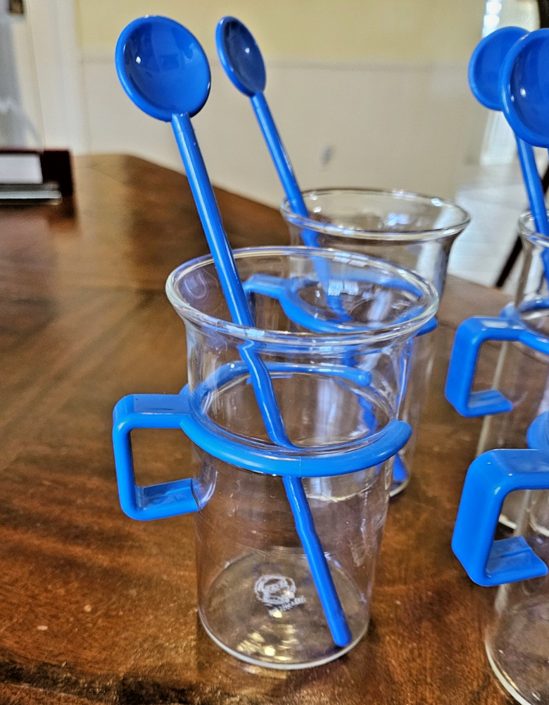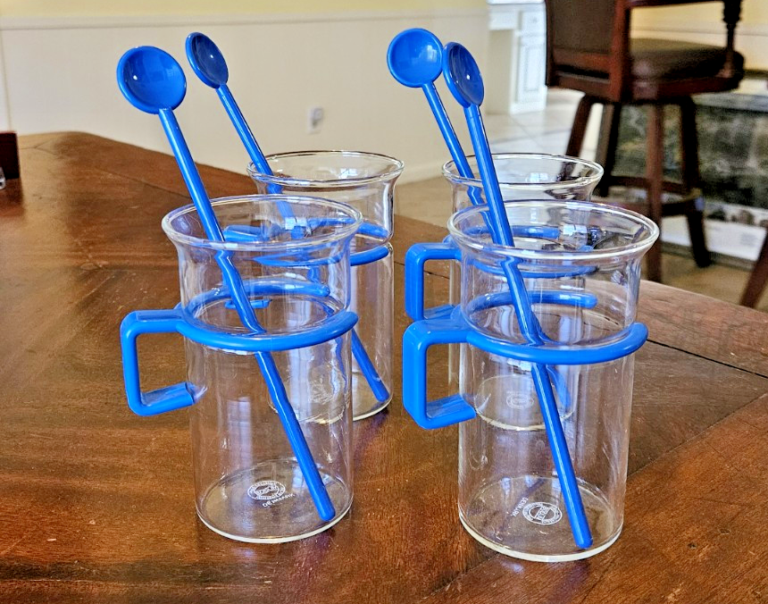 Capacity:10 fl ozService For:4Style:Vintage/RetroBrand:BODUMFeatures:Unique Handles And DesignItem Width:2.5"Type:Coffee Mug SetNumber of Items in Set:Three-PieceSet Includes:Coffee CupShape:RoundCountry/Region of Manufacture:DenmarkItem Height:4.5"Color:BlueMaterial:Borasilicate Glass
