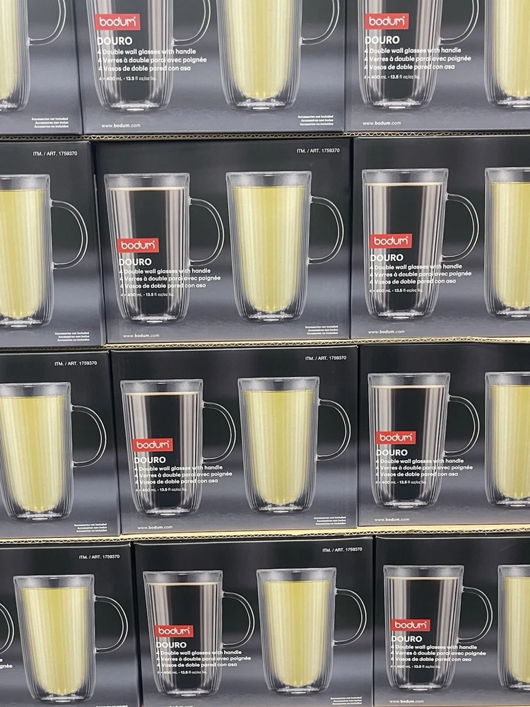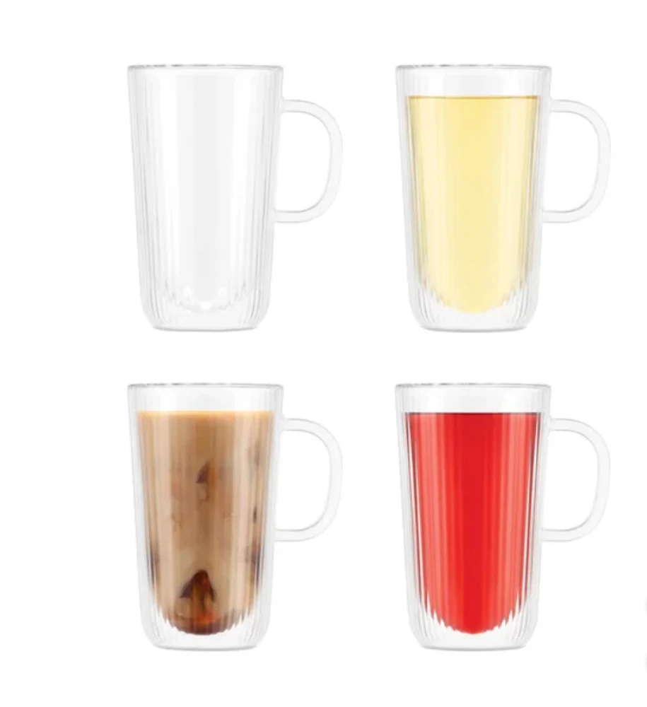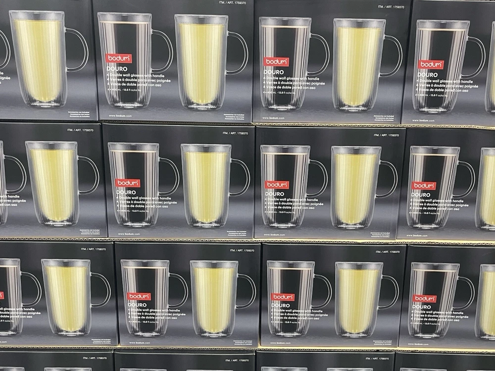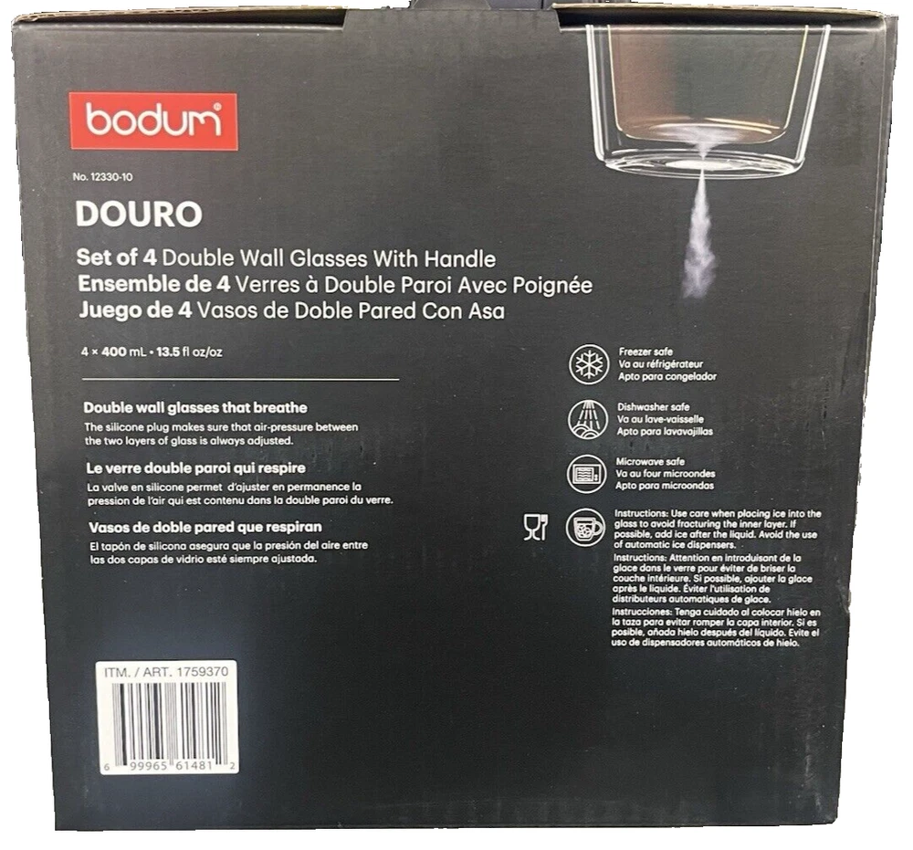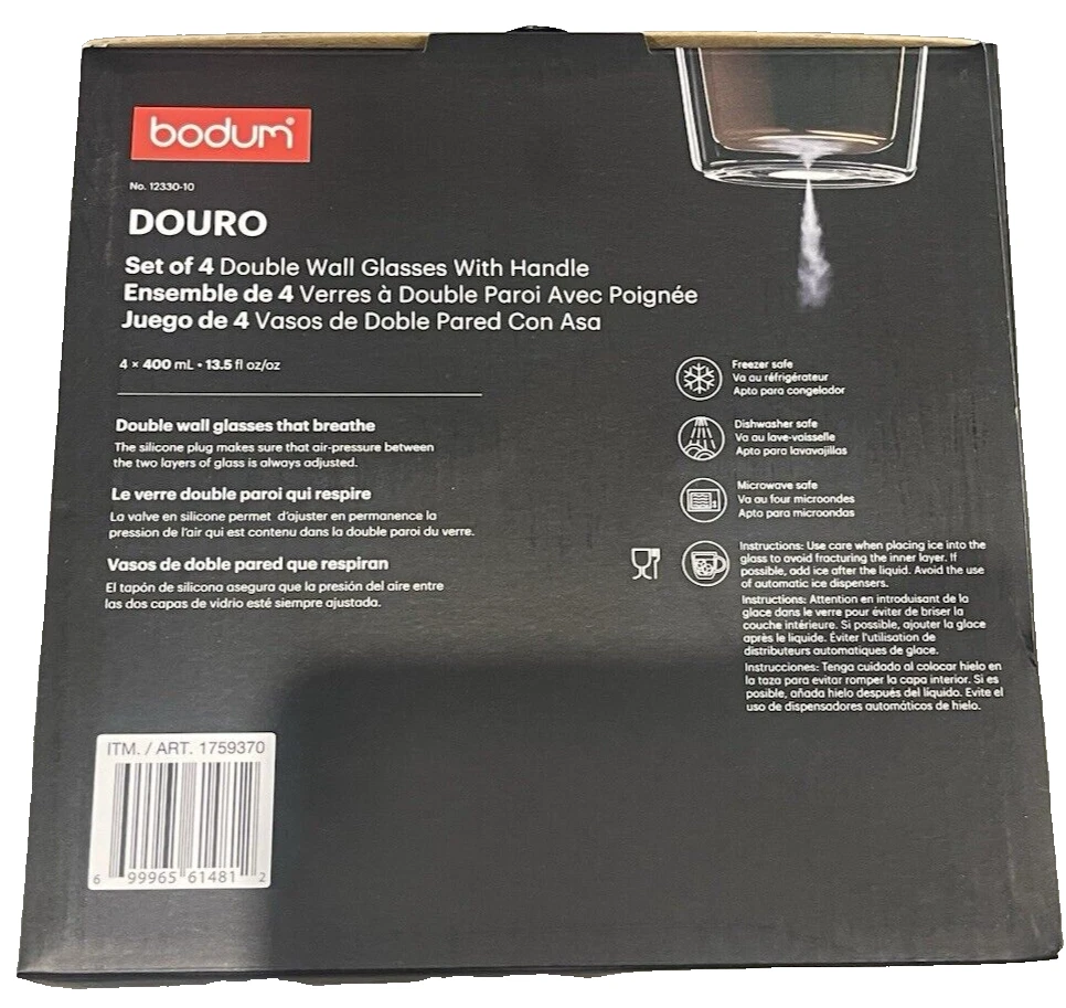 ORDERS GETTED BEFORE 2PM - SAME DAY SHIPMENT!!! AFTER 2PM - NEXT DAY SHIPMENT!!! OUR WAREHOUSE WORKING MO-SAT (9am-9pm) FAST FREE SHIPPING IN USA!!! CLEARANCE! Last pieces remaining—future availability currently unknown!!! Features: Double-Wall Thermal Construction Heat-Resistant Borosilicate Glass Dishwasher Safe Microwave Safe Product Details Add European charm and modern innovation to every sip with these DOURO Double Wall Mugs. Each mug is expertly crafted from heat-resistant borosilicate glass, and is individually mouth-blown, combining innovative function with timeless style. The double-wall construction regulates the temperature of your beverage of choice, keeping hot drinks hot and cold drinks cold, while a discreet silicone vent at the base of the mug regulates the internal pressure to reduce the risk of cracks and eliminate messy condensation - making them safe and comfortable for wrapping your hands around while savoring your morning coffee, afternoon tea, or bedtime cocoa. Gorgeous and ingenious, the DOURO Double Wall Mugs are sure to be a beautiful and lasting addition to your drinkware collection. Includes: (4) 13.5 oz. Double Wall Glass Mugs Specifications Brand Bodum Capacity 13.5 Ounce Color Clear Dimensions - Tall 6.1 in. Dimensions - Wide 3.5 in. Features Dishwasher Safe Features Microwave Safe Material Borosilicate Glass Number of Pieces 4 Piece