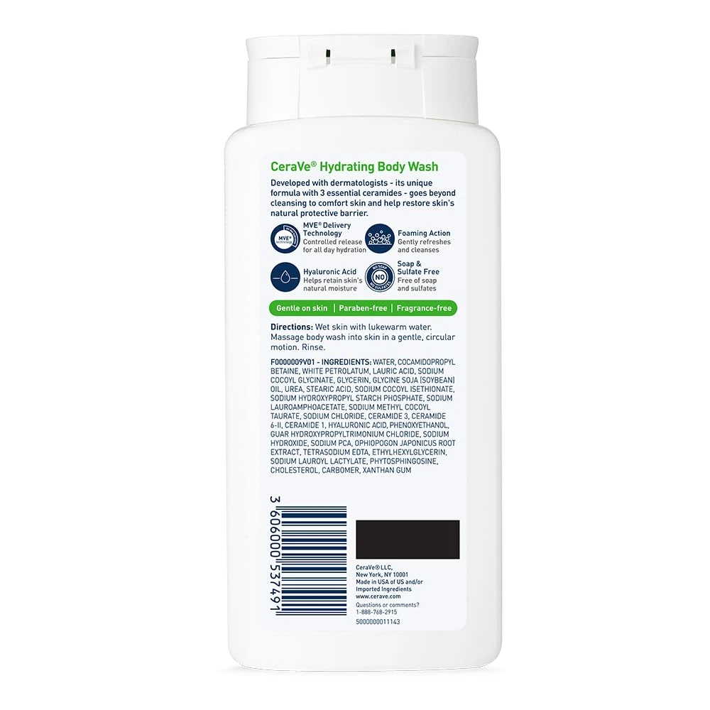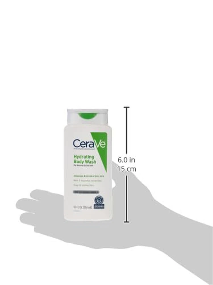 [ CLEANSE & REFRESH ] Formula forms a gentle foaming lather to cleanse without stripping skin of its natural moisture. Skin is left feeling moisturized & smooth, never tight or dry. [ HYDRATING BODY WASH ] Formulated with Hyaluronic Acid to help retain skin’s natural moisture, and Glycerin to help moisturize. [ SKIN CARE FOR DRY SKIN ] Massage CeraVe Hydrating Body Wash into skin in gentle, circular motions with a washcloth or shower loofah. Can be paired with CeraVe Moisturizing Cream to lock in moisture. [ 3 ESSENTIAL CERAMIDES ] Ceramides are found naturally in the skin and make up 50% of the lipids in the skin barrier. All CeraVe products are formulated with three essential ceramides (1, 3, 6-II) to help restore and maintain the skin’s natural barrier. [ DEVELOPED WITH DERMATOLOGISTS ] CeraVe Skincare is developed with dermatologists. Fragrance free, paraben-free, sulfate-free, soap-free, allergy-tested, and non-comedogenic. Accepted by the National Eczema Association. Developed with dermatologists, CeraVe Hydrating Body Wash contains a gentle, foaming formula that cleanses and moisturizes the skin. This foaming body wash for normal to dry skin cleanse and refresh the skin while restoring the skin's natural barrier. The formula contains hyaluronic acid to attract needed moisture to skin's surface and 3 essential ceramides (1,3 and 6-II) to help repair the skin's protective barrier. Also includes emollients to moisturize and soften the skin all day. •Fragrance-free •Paraben-free •Sulfate-free •Soap-free •Non-comedogenic •Accepted by the National Eczema Association •Suitable for normal to dry skin Key Ingredients : • Ceramides : Essential for healthy skin, ceramides help restore and maintain the skin’s natural barrier • Hyaluronic Acid : This ingredient attracts hydration to the skin’s surface and helps the skin retain moisture.