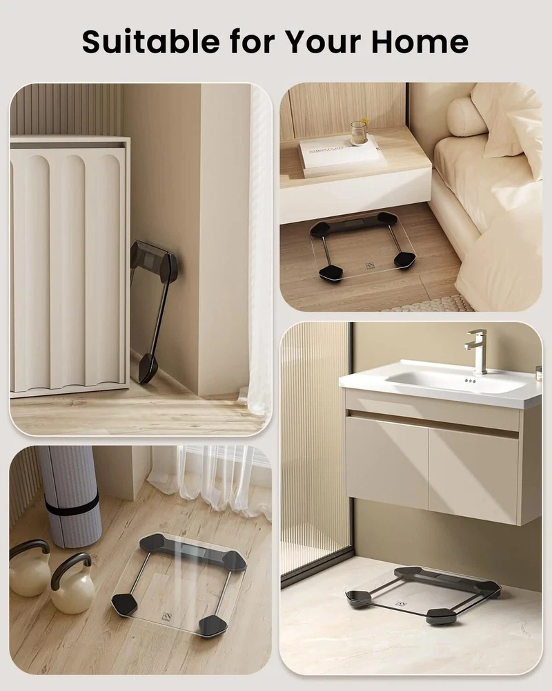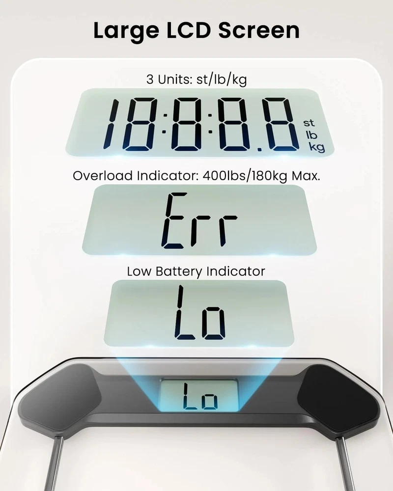 About this item Reliable Measurements: Accurate readings up to 400 lbs in 0.1 lb (0.05 kg) increments with 4 high-precision sensors. Large Weighing Platform: 11*11-inch platform for comfort and safety. Ideal for family use. Easy to Use: Backlit LCD for clear readings, perfect for day and night usage. Auto Power-Off: Energy-saving feature for prolonged battery life. Durable Tempered Glass: 5mm thick tempered glass construction for durability and style. Anti-Slip Pads: Ensures stability and security during weighing. Curved Edges: Accident-proof protection for enhanced safety. Batteries Included: 2 AAA batteries included for immediate use. Unique Appearance: Clear glass platform with a minimalistic yet stylish design, blending well into any home decor. Specifications: Weight Capacity: 400lbs/180kg Graduation: 0.05kg/0.1lb Display: LCD display Platform: Tempered glass Units: kg/lb/st:lb Dimensions: 11.02" x 11.02" x 0.89" Package Information: 1 x FITINDEX digital body weight scale 1 x user manual 2 x AAA batteries (included)
