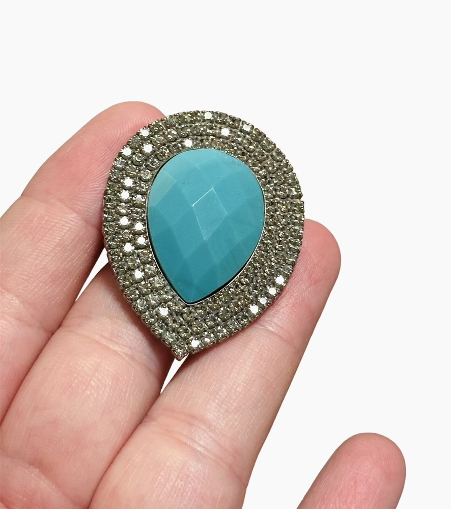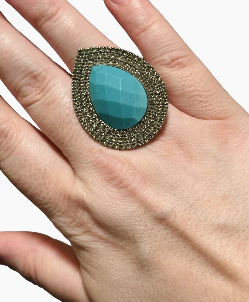 Pre-loved - in very good condition - Bohemian Bardot Style Fashion Stone Turquoise Rhinestone Ring. Made in Brazil. Adjustable sizing - No stones missing - Elegant and beautiful! The only fault is the back where you can see the wear.