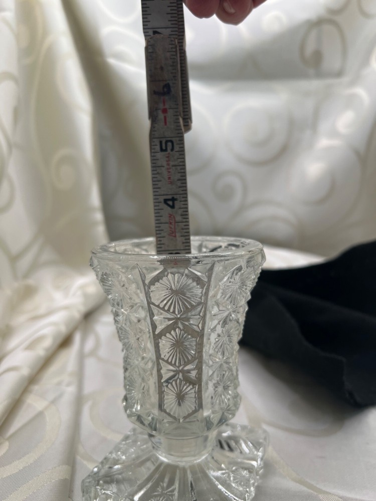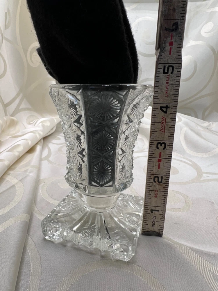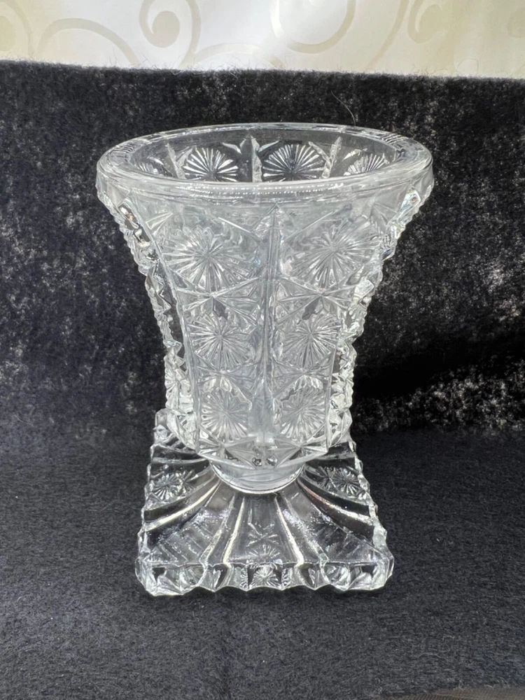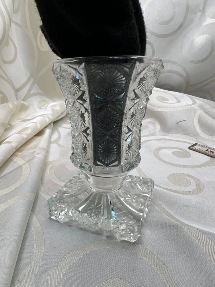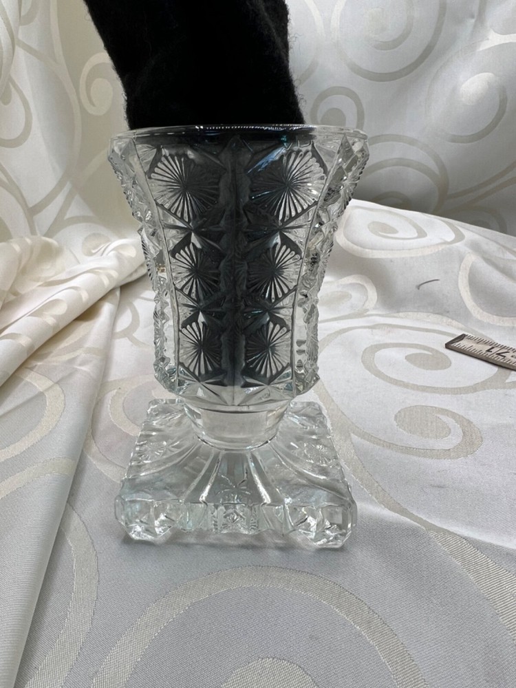 This is an unmarked Bohemian Crystal vase made of clear crystal in a pressed glass production style. The vase has a traditional Bohemian design with intricate patterns and a high-quality craftsmanship, perfect for displaying fresh flowers or as a standalone decorative piece.