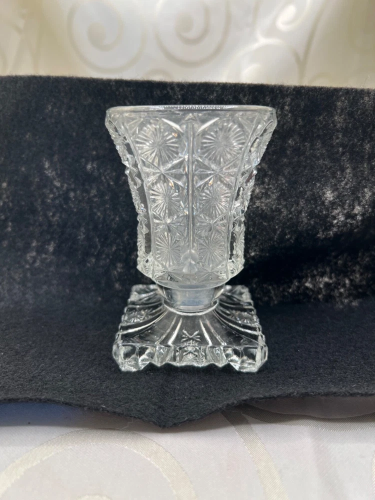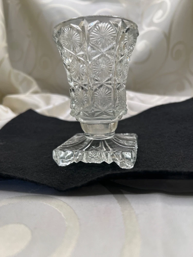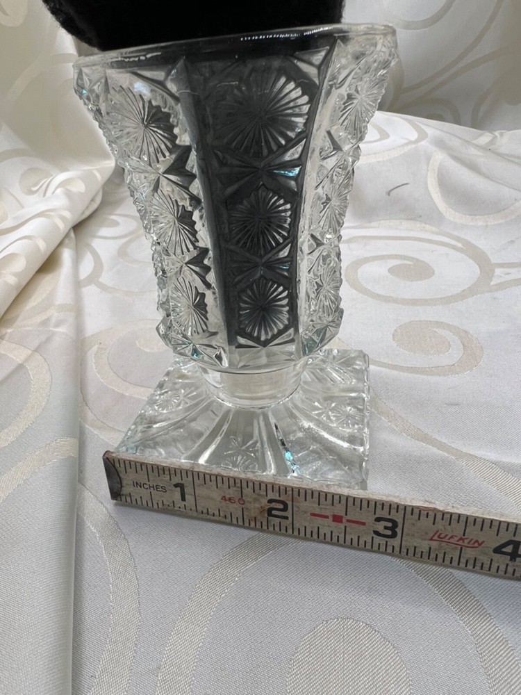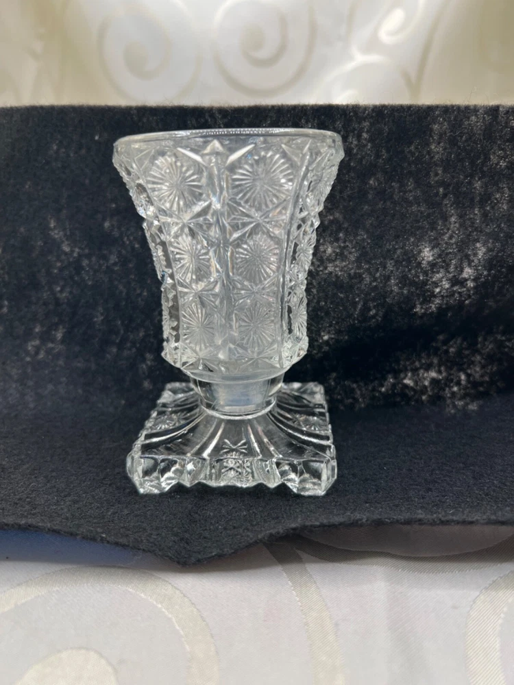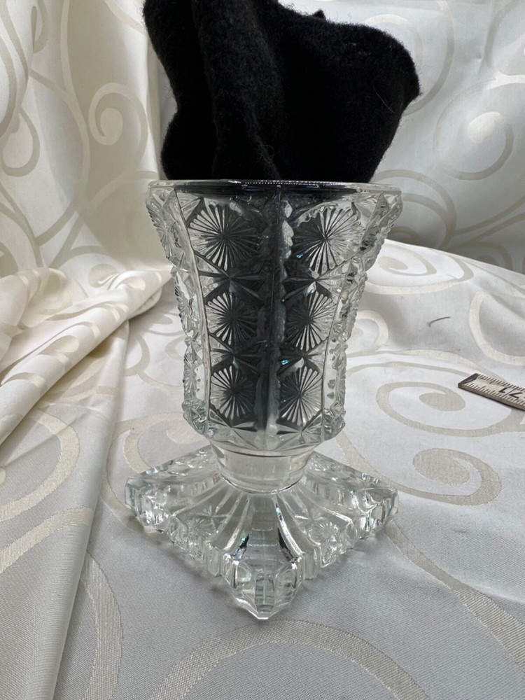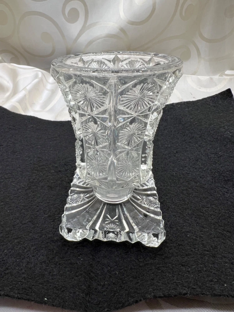 This is an unmarked Bohemian Crystal vase made of clear crystal in a pressed glass production style. The vase has a traditional Bohemian design with intricate patterns and a high-quality craftsmanship, perfect for displaying fresh flowers or as a standalone decorative piece.
