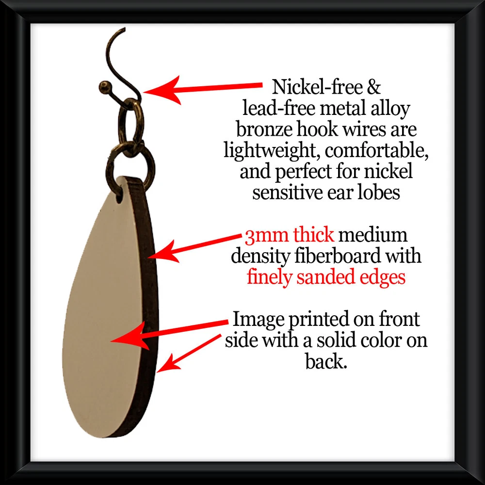 Abstract Bohemian Floral Art Print Earrings Trendy & Unique Earrings & Jewelry Gifts Handcrafted Wood Earrings ~ Original Digital Imagery in Style of Classic Bohemian Print ~ 1.54"x0.97" - 39.3mm x 24.6mm Teardrop Dangle Earrings The artwork is printed using an Epson Ecotank professional photo printer with top quality dye-sublimation ink on HTVRONT sublimation paper . The image is then cut to size and professionally heat pressed onto the laser cut prepared wood. The back side is a solid color. WHAT IS SUBLIMATION? "The dye-sublimation process transfers the dye into the substrate rather than depositing it on the surface, resulting in a more permanent image. In addition, because the dye-sublimation process uses heat to vaporize the ink, dye-sublimation ink produces higher-resolution prints than any inkjet printer on the market ." Nickel & lead free along with being very lightweight make these perfect for nickel sensitive ears lobes. They also include the rubber back stoppers to keep them in place. Say "Goodbye" to over priced plated jewelry! These are wooden earrings which means NO PLATING. AND NO PLATING MEANS - NO TARNISHING, DISCOLORING, RUSTING, OR EAR IRRITATIONS LIKE YOU GET FROM CHEAP PLATED JEWELRY AT NEARLY TWICE THE PRICE. Arrive ready for gifting . Made in the USA . Handcrafted in our home based art studio in Cleveland, Ohio . ADDITIONAL INFORMATION: The watermarks will not appear on your earrings. The mark is to protect our personal artwork from sellers who feel it is easier to take the artwork, rather than create their own artwork, to create their jewelry products. Listing is for one pair of earrings as pictured. Back of earrings will be a solid color. This item is not intended for children under the age of 5 because of choking hazard. Earrings are water resistant but please remove when bathing or swimming . Please remember that monitors, settings, and devices display colors slightly different and there may be a slight variation in the colors from what you see on your personal device(s). All images are enlarged to show even the smallest of details, please refer to the description for size. . Feel free to contact us with any questions using the "contact seller" option. Thanks for looking through our store and have a blessed day.