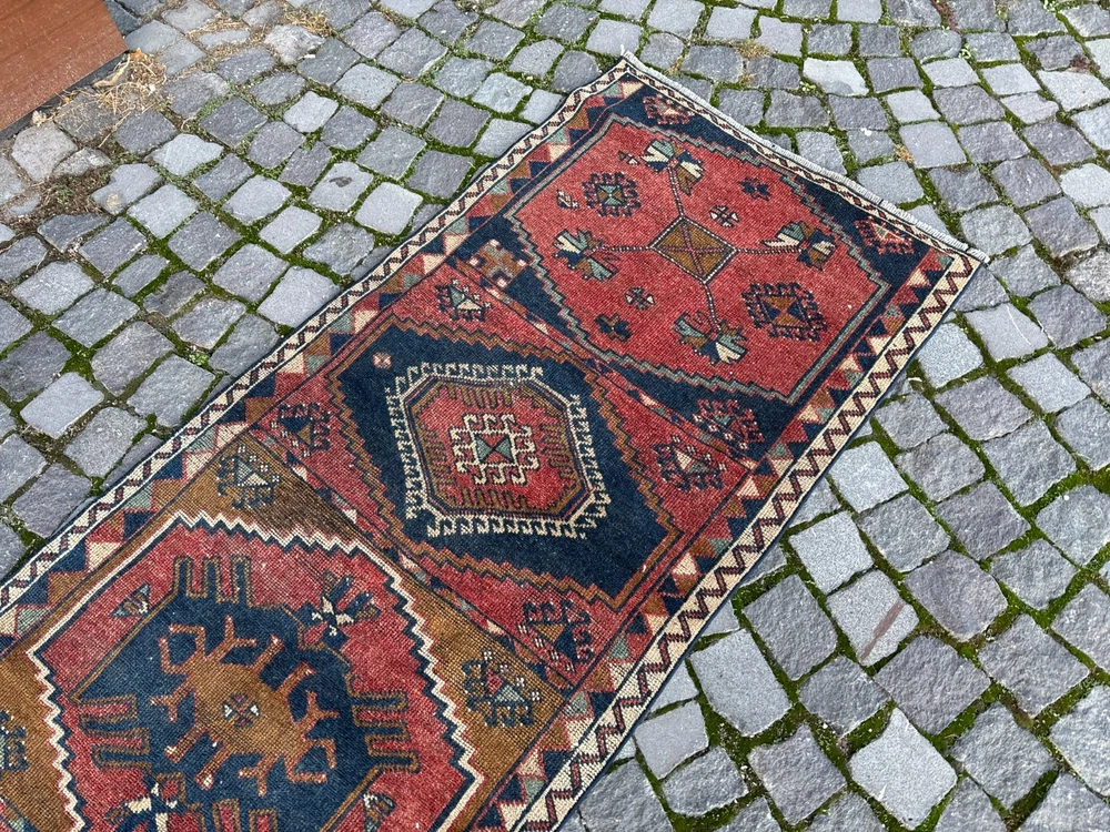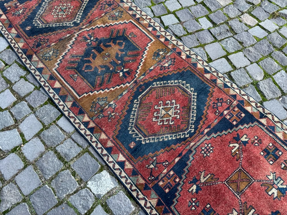 An old (approximately 45-60 years old) hand knotted / hand woven Turkish rug from the Middle Anatolian Region and made of genuine, high quality wool, in natural colors. Our distinguished Antiques and Vintage rugs, each with its own unique story, have been carefully selected from every corner of Turkey. RUG DETAILS * One-of-a-kind vintage rug * Dimensions: 2,6 x 8,5 ft = 33 x 103 inc = 82 x 262 cm * Low pile: approximately 0.2"(0.5 cm) * Dyed with natural dyes * Product code : RR 1889 SHIPPING * Free shipping on all items. * Usually shipped via FedEx or UPS. * Item will be ready for shipment within * Estimated delivery 3-5 business days 1-3 business days with a tracking number. All of our rugs have been professionally cleaned and ready to ship before being listed. These unique vintage rugs have normal wear related to their age. We believe this adds to the authenticity of these hand-woven beauties. We inspect all rugs carefully before Shipping, but in the unlikely event that due to our fault, the goods are not fit for purpose, damaged/defective, or we ship the wrong item, we will issue a 100% refund. We are a team of experienced professionals who are dedicated to ensuring your items arrive safely. Please note that our photos accurately represent the colors of the rug, however it may look different in the light in your home or against different colored floors. We are so excited to share the beauty and art of rugs with you and to see how your personal spaces transform! I do my best to build a great experience in online rug shopping for you, just look at the reviews. Please feel free to write me over conversation if you have any questions about the rug or price. I will be happy to answer to you. Thank you, Yusuf.