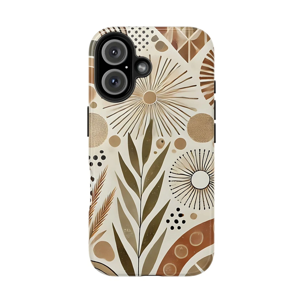 "Boho Chic Mosaic" blends modern bohemian style with a natural earth-toned palette, featuring a mix of geometric shapes, botanical elements, and abstract sunbursts. Protect your phone in custom style with this tough phone case. This lightweight phone case is impact-resistant thanks to its TPU lining and Polycarbonate shell. Meanwhile, the interior rubber liner adds an extra layer of protection to your phone for total peace of mind. Compatible with iPhone and Samsung smartphones. Check sizes for all available phone models. (iPhone 16 model now available). .: Materials: polycarbonate (shell), TPU (lining) .: 2-piece design with impact resistance and shock dispersion .: Interior rubber liner for extra protection (appearance may vary across phone models) .: Glossy finish .: Supports wireless charging (not including MagSafe)