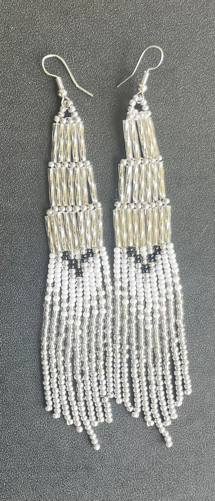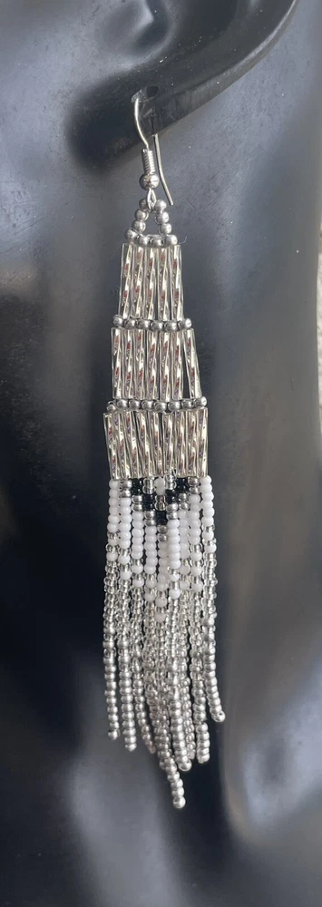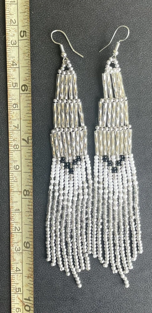 1 pair of long silver and white with black long seed bead beaded earrings. You will receive earrings pictured. The earrings are handmade with seed beads. The earrings are approximately 5" long with the ear hooks included. They are for pierced ears. 0-ea-seed-024-1