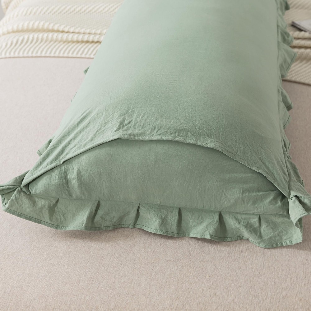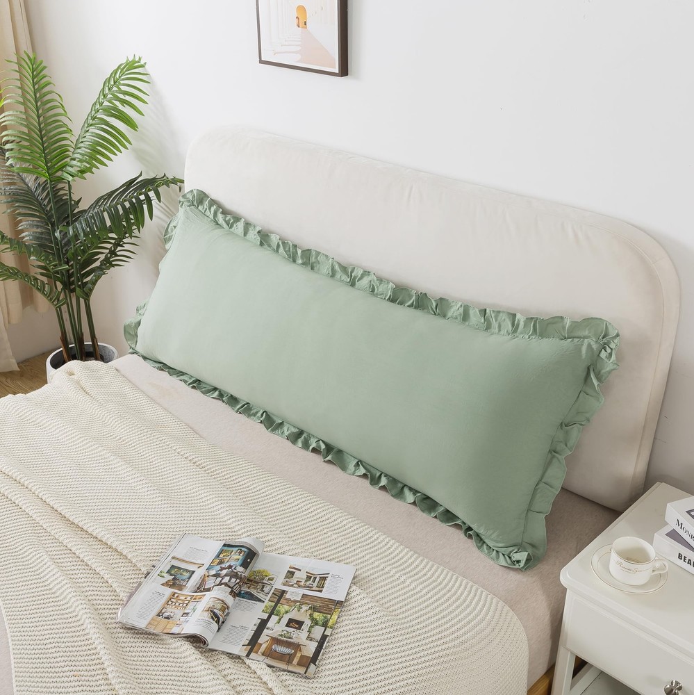 These pillowcases are meticulously crafted from high-quality synthetic fiber, ensuring a soft and comfortable feel for your sleep. Whether it's a hot summer night or a chilly winter evening, these pillowcases maintain excellent breathability and temperature regulation, guaranteeing a restful sleep every night. Available in four classic colors—green, grey, light coffee, and white—these pillowcases seamlessly blend with various bedroom decor styles, be it modern minimalist, vintage elegance, or country charm. Additionally, the pillowcases come in three sizes: Queen Size, King Size, and Body Size, to meet your diverse pillow needs. The edges of the pillowcases are adorned with a delicate ruffle design, adding a touch of elegance and romance to your bedroom's overall look. Whether for personal use or as a thoughtful gift for family and friends, these pillowcases are an excellent choice. Moreover, these pillowcases are machine washable, making cleaning and maintenance effortless. With simple machine washing and low-temperature drying, these pillowcases remain fresh and tidy for an extended period. Choose pillowcases to add comfort and beauty to your bedroom. PACKAGE INCLUDE: 1 x Body Size Pillowcase (20 x 54) (Pillows are not included) Material: Made of 100% washed Microfiber, super soft and comfortable. Stain resistance, breathing ability, wrinkle resistance, easy cleaning FUNCTION: Our solid color cotton pillow sham helps create a peaceful oasis, allowing you to sleep peacefully. We offer a variety of color options for every living space, and its color coordinates with surrounding bedroom decor Envelope Closure: The Microfiber Pillow sham features envelope closure, no zipper. So, it won't scratch your face, and is easy to take out the pillow insert Easy to Care: The Microfiber Pillowcases are easy to maintain. Simply machine wash in cold water on a gentle cycle for a like-new restoration and also you can wash it by hand