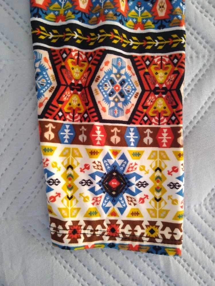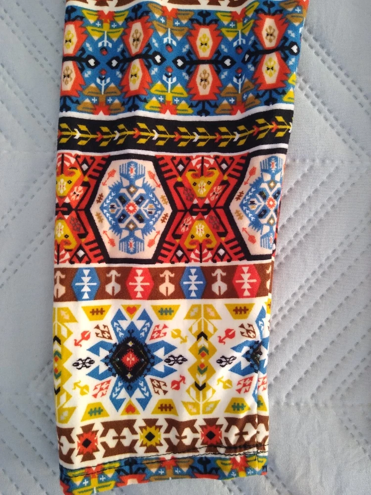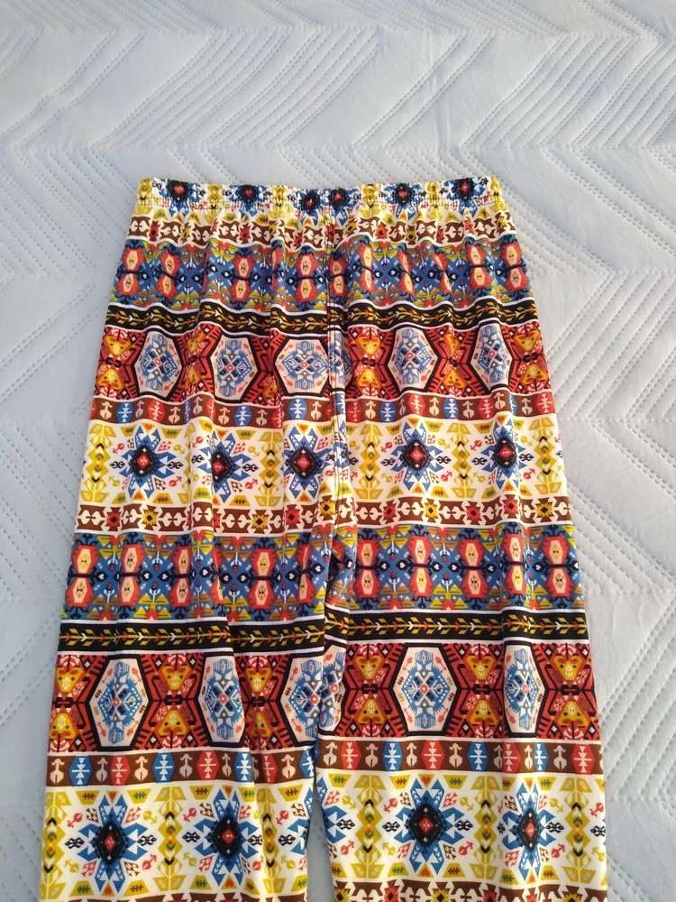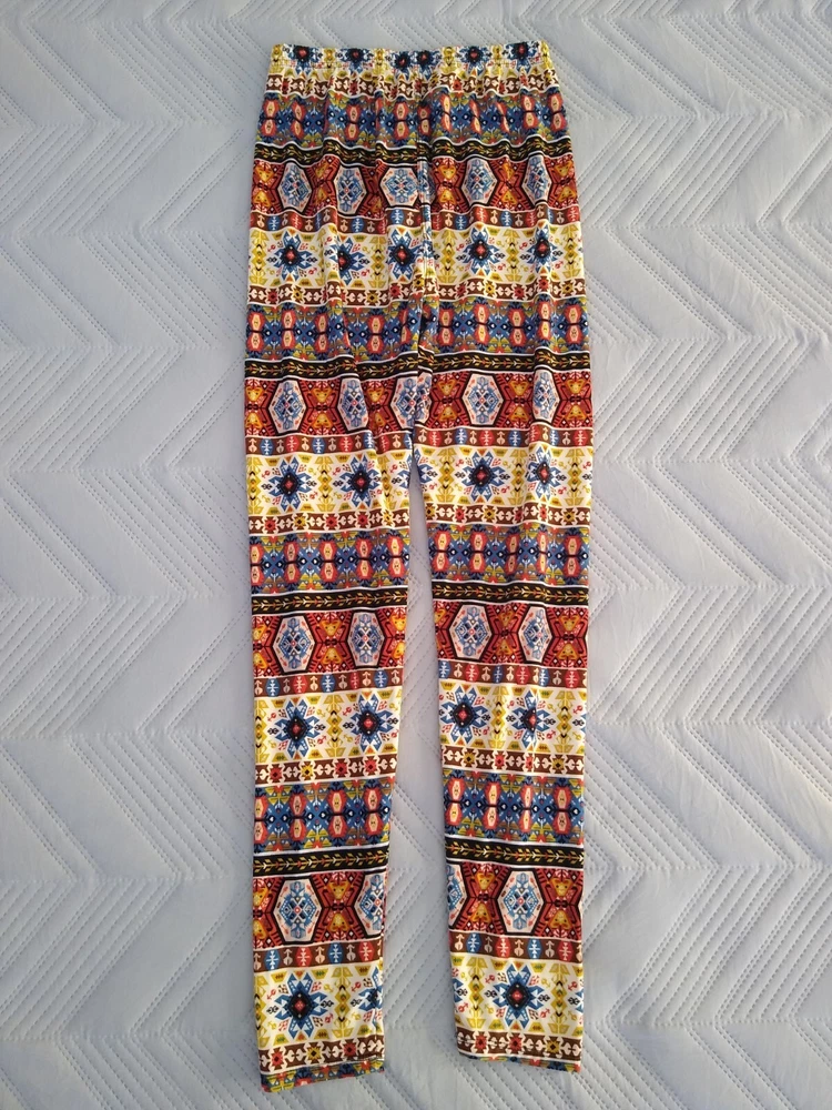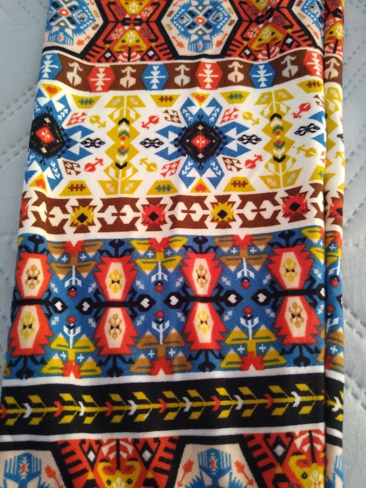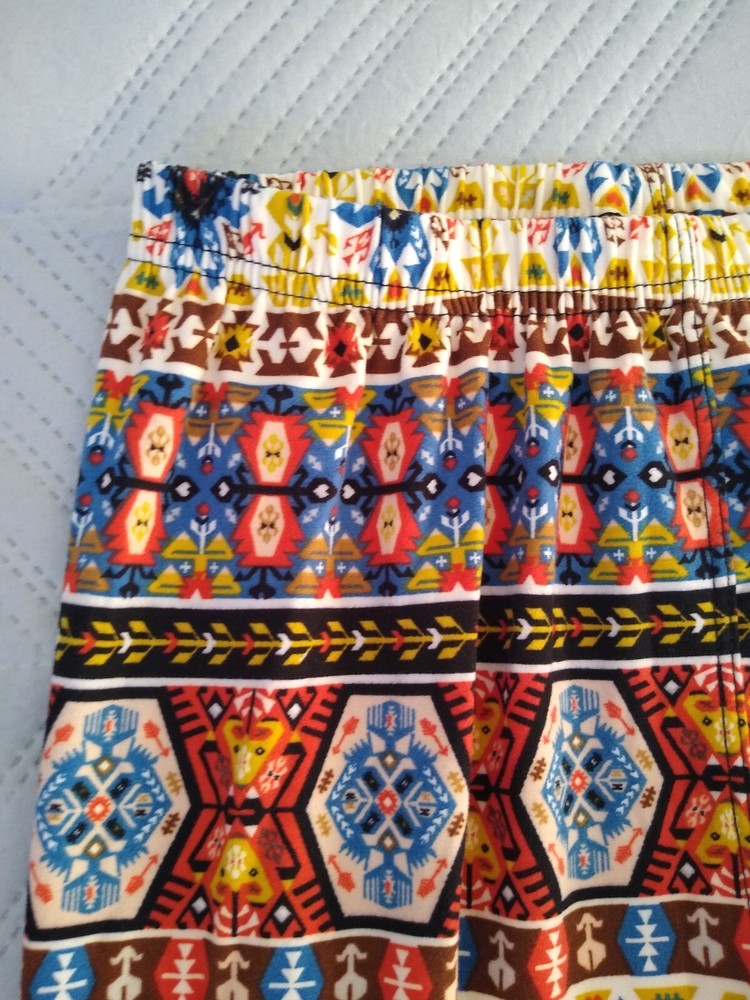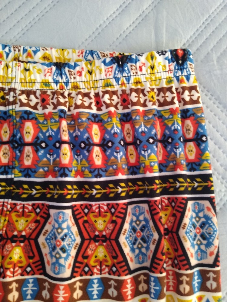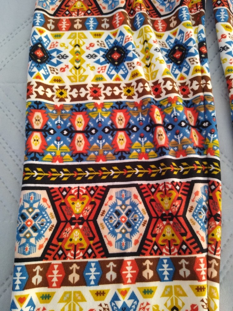 Leggings Bold Print Funky Groovy Soft Fabric Aztec Southwestern Tribal Print 70s Colors S M Brand: Unbranded Size: Tag says one size; seems best for S M, see measurements Fabric: 92% Polyester, 8% Spandex (soft fabric similar to jersey t-shirt; not slick or glossy) Measurements taken on only one side while item was laying flat: Waist: 11.5” (elastic) Hips: 16.5” Rise: 12” Inseam: 26.5” Smoke-free and pet-free home Very good condition—no holes, rips, or stains; wear to bottom edge of interior fabric content label Buyer pays shipping based on weight. Package will include tracking and you will be notified as soon as your item ships. Delivery times vary based on destination. Happy to bundle items into one package to save you money on shipping. Feel free to contact me with any questions. Thank you for visiting my page. Hope you have a fun day.